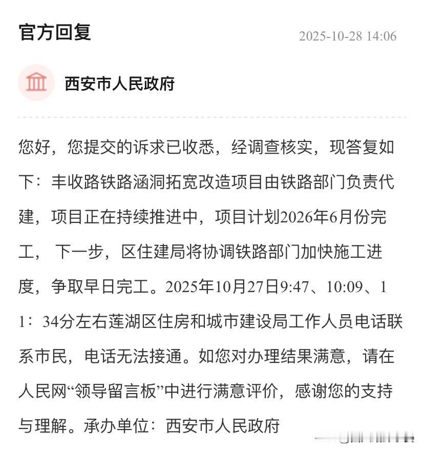 关于西安市莲湖区丰收路铁路涵洞扩建建设情况 莲湖区丰收路陇海铁路涵洞扩建工程建设最近几个月一直停工,请问是否有计划改变,涵洞每天早晚高峰都堵的水泄不通,请领导能核实情况推进建设,让周围群众不再为出行烦恼,谢谢! 官方回复 2025-10-28 14:06 西安市人民政府 您好,您提交的诉求已收悉,经调查核实,现答复如下:丰收路铁路涵洞拓宽改造项目由铁路部门负责代建,项目正在持续推进中,项目计划2026年6月份完工, 下一步,区住建局将协调铁路部门加快施工进度,争取早日完工。