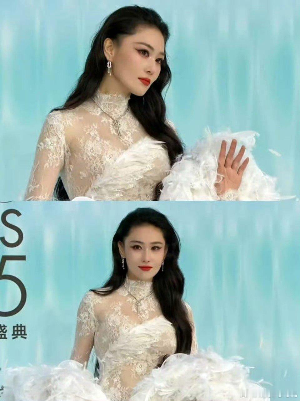 张馨予出场秒了 张馨予这次的造型真的是教科书级别的红毯穿搭,半透视蕾丝裙展现出完美的身材比例,长羽毛披肩增添了几分梦幻感,25斤的重量不仅没有成为负担,反而让她的气场更加强大。