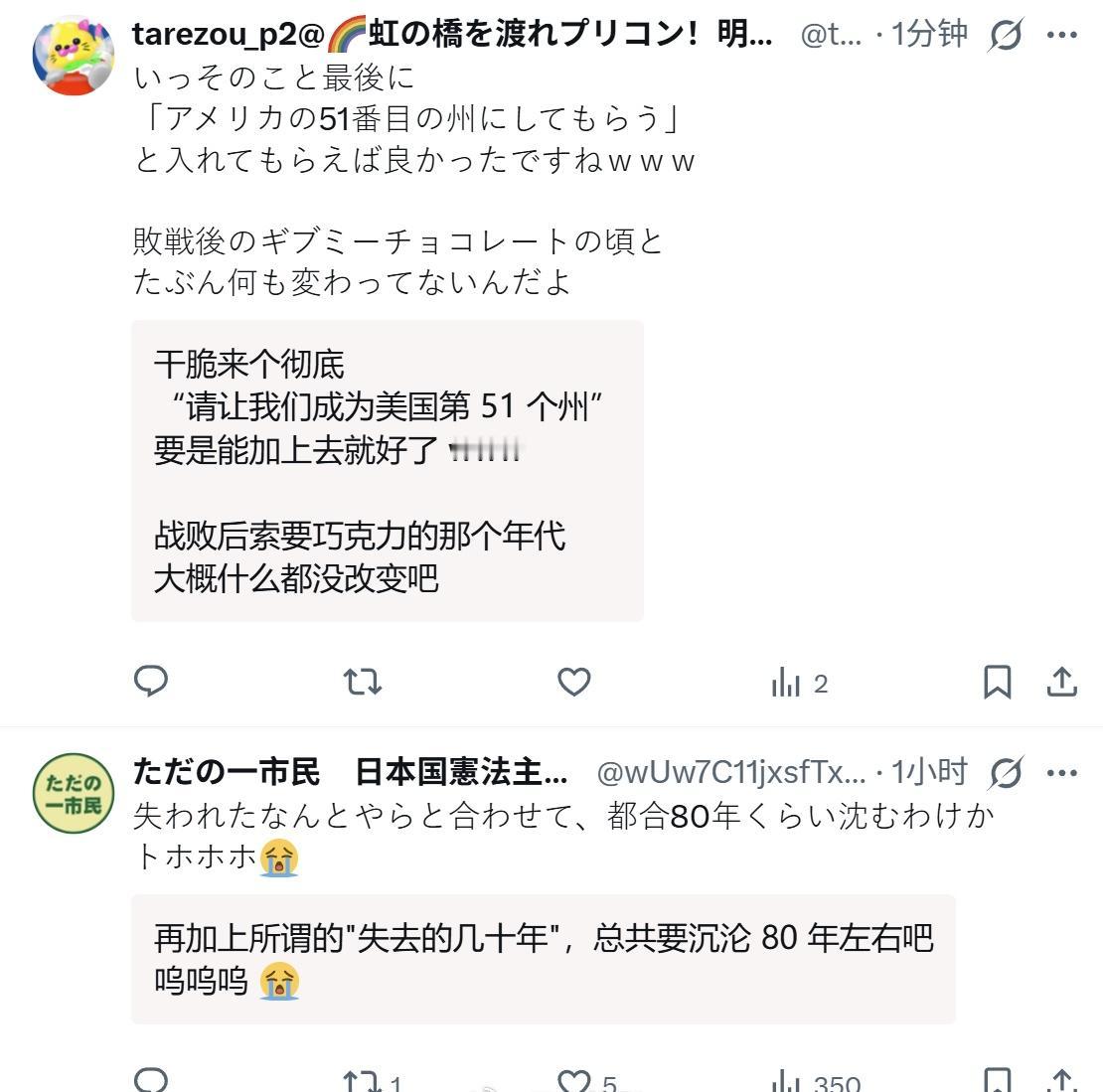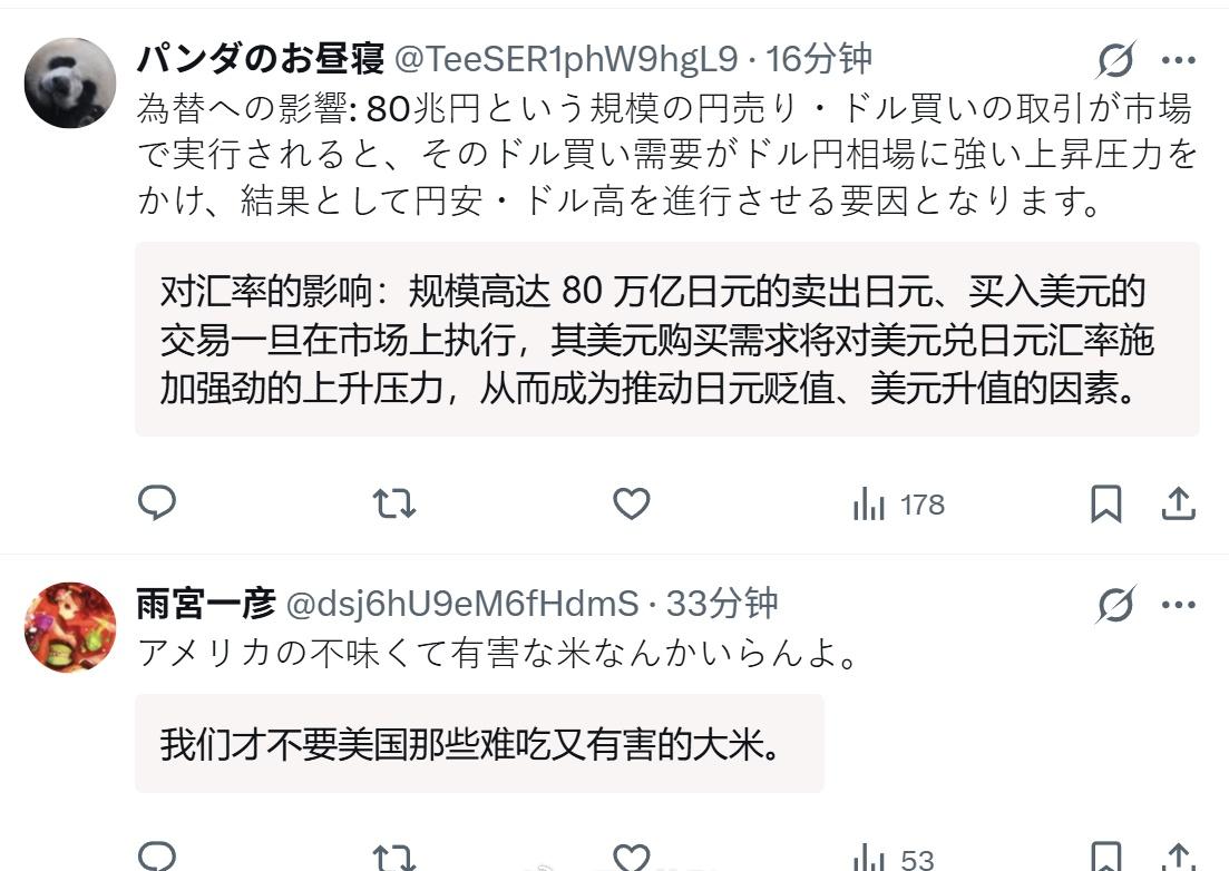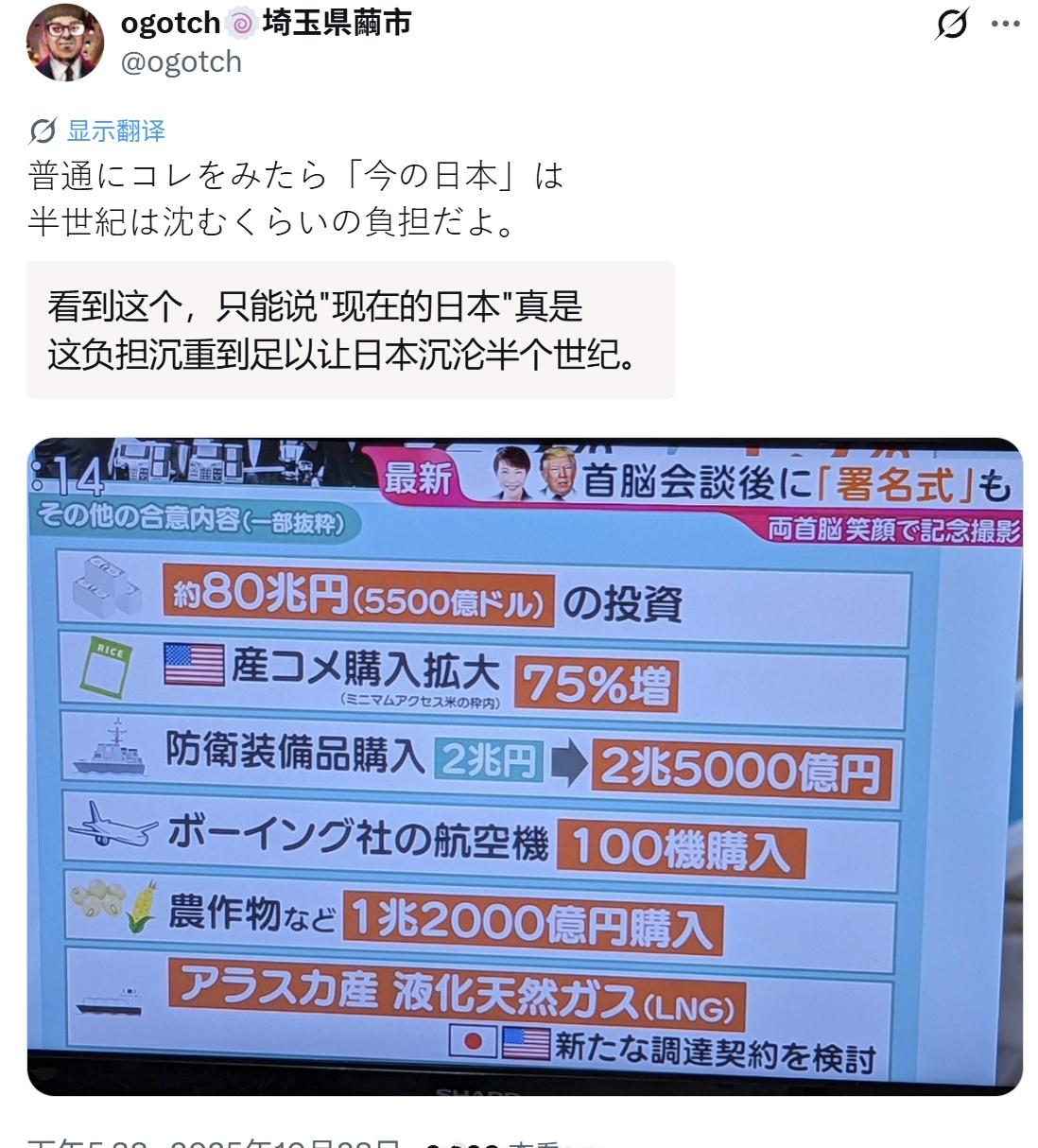 推特上的日本人在哀叹,本次和美国签署的各种投资和购买协议“足以让日本沉沦半个世纪”。
