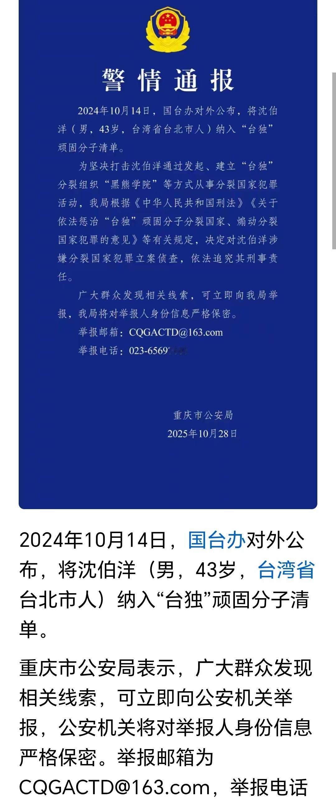 看来这招对付台独好用。重庆公安局对台独顽固分子沈伯洋进行立案侦查。可能以后全国各地的公安部门都会行动起来,对台独顽固分子进行立案侦查,然后全球通缉。 上次厦门市公安局通缉了一堆台湾网军台独分子,结果这些人退役之后贷款都贷不了。现在侦办这些台独顽固分子,到时候全球通缉,他们就会被困死在台湾。 看看下一个会是谁,会不会是曹兴诚? 现在套在他们脖子上的绳索越来越紧了,什么时候轮到民进党现在台上的大佬,解放台湾的日子就近了。 期待中…… 点右上角关注我,我们一起去看这个魔幻的世界