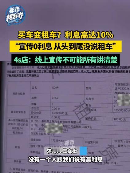 河南洛阳,女子带孩子去买车,跟4s店谈好,车辆总价138000元,不用首付,零利息。可女子孩子签完字后,这才发现他们以为的贷款买车变成了融资租赁,5年以内他们对车辆只有使用权,没有所有权,车子不是他们的,并且连本带息要还174000元,利息10%。女子觉得对方宣传的0息,纯粹是在诱导他们。销售经理却说:客户只有几千块钱,就想把车提走,他只要求0首付,月供4000以内,我是按照这个诉求来的。 “不是说好的零利息吗?怎么一算多了三万多块?”王女士在4S店签完字准备提车时,心里那股高兴劲儿还没持续半个小时就被打断了。 她带着孩子去买车,本想着靠着“零首付、零利息”的活动,轻轻松松地把车开回家,没想到,一场看似优惠的交易,背后却藏着一场“文字游戏”。 当车子快要交付时,一张还款计划表让王女士愣住了,5年下来,要还的钱一共是174000元!她算了算,这等于是多出了36000元。更让她没想到的是,当她拿着合同仔细看时,发现自己办的根本不是“贷款购车”,而是“融资租赁”。 也就是说,这车在5年之内根本不属于她,她只有“使用权”,不是“所有权”。 这下,王女士彻底傻了眼,而销售经理则有些无辜的说道:“王女士只有几千块钱,又想提车走,我们当然得给她做0首付的融资租赁,她要求月供4000以内,我们是按照这个诉求办的。” 一句“客户要求”就把锅全甩回到王女士身上。可王女士坚持说,在整个沟通过程中,没有人明确告诉她,融资租赁和贷款买车的区别。 之后为了解决纠纷,销售经理提出了两种方案:要么一次性连本带息结清,要么先还半年,之后按贷款额的10%缴纳违约金。 这两种方案,放在谁面前都很难接受,王女士表示自己本来是想买辆代步车,却没想到被绕进去成了“租车”;更没想到所谓“零利息”,实际要比正常贷款贵出一大截。之后王女士打算走法律程序,希望能追回自己的损失。。 这件事曝光后,引起了不少网友的讨论,有人说:“融资租赁本身不违法,但必须要讲清楚。”也有人感叹:“4S店的套路真是越来越深了。” 事实上,这类“零首付购车”的陷阱,在很多地方都频频出现。销售在推销时强调“轻松提车”,但对“租赁”和“贷款”的区别却故意模糊。消费者一听“0首付0利息”,以为捡到了便宜,最后才发现被高利率“割了韭菜”。 所以说,买车时千万别只看“月供多少”“首付多少”,尤其是当销售嘴里蹦出“零利息”“零首付”“无压力”等字眼时,更要小心背后的合同条款。 有时候,那些听上去最诱人的“零利息”,才是最贵的坑。 信息来源: 河南都市频道丨买车变租车?利息高达10%“宣传0利息 从头到尾没说租车” 文丨小王 编辑丨史叔