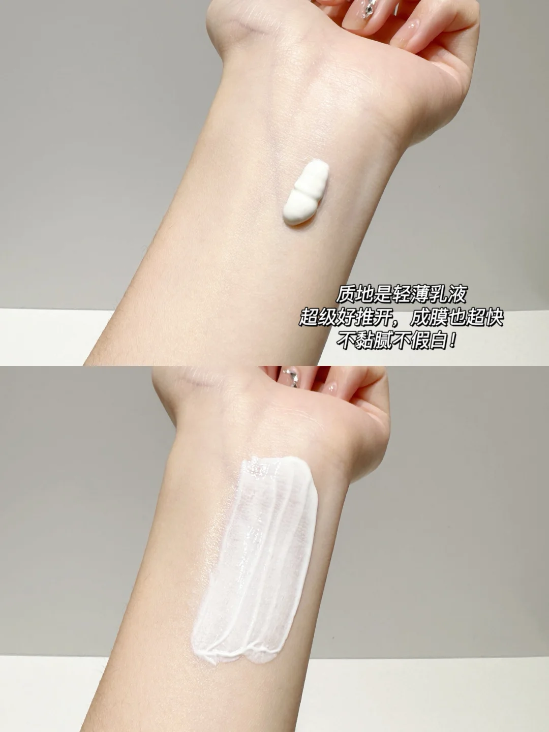 质地是轻薄乳液那种,超级好推开,成膜也超快,不黏腻不假白!