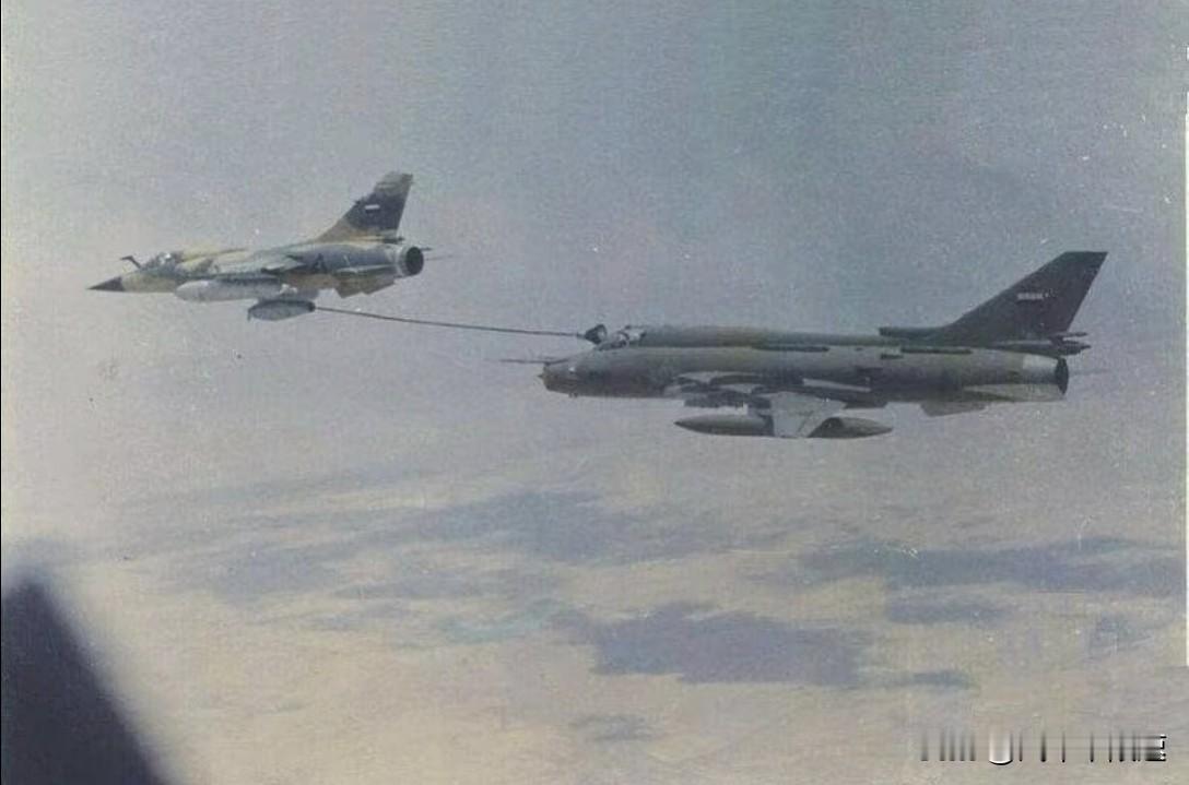 能算得上军界奇观吧,幻影和米格21手牵手,相濡以沫的搀扶。哈哈,真的像前一秒刚干过仗的哈士奇和柯基,下一秒结伴而行,一起耍球! 图片拍摄于两伊战争期间,伊朗的幻影III为伊拉克的米格-21进行空中加油,这种跨阵营装备的互动在战争中较为特殊,反映了当时复杂的战场补给与装备运用情况。