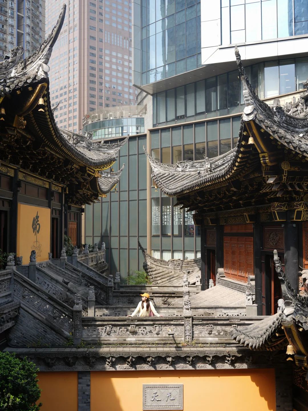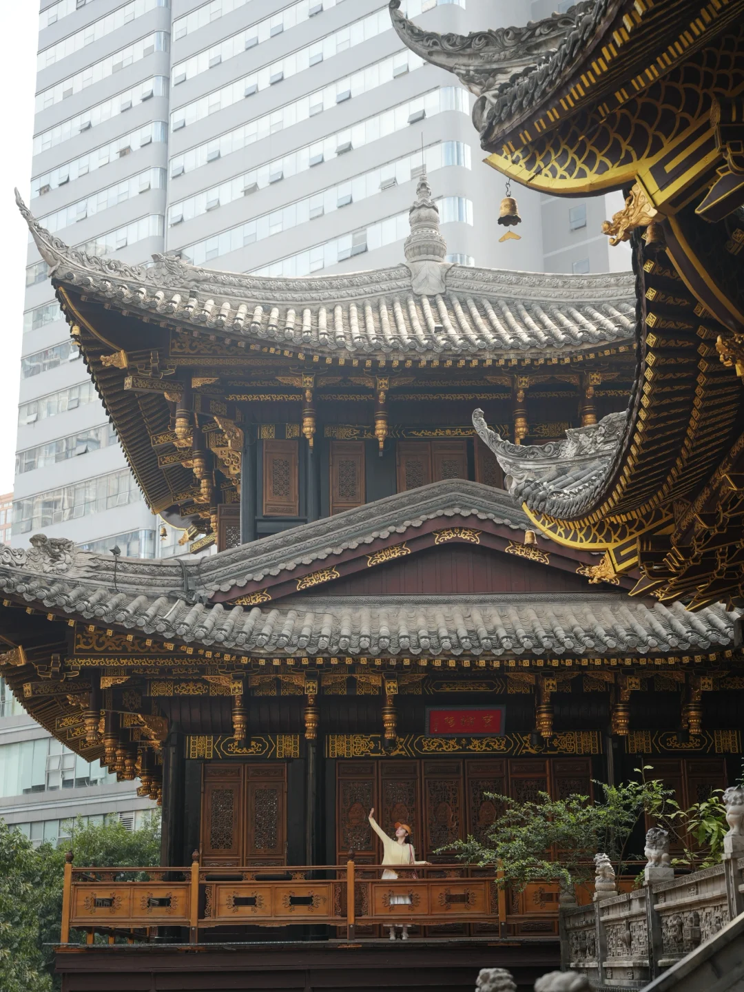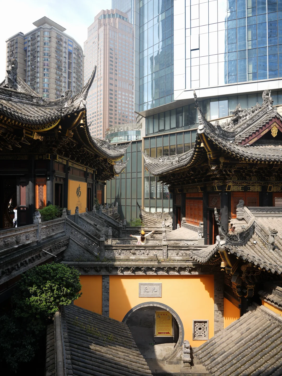低机位仰拍,把寺庙飞檐和背后联合国际大厦同框,古代与现代相结合!