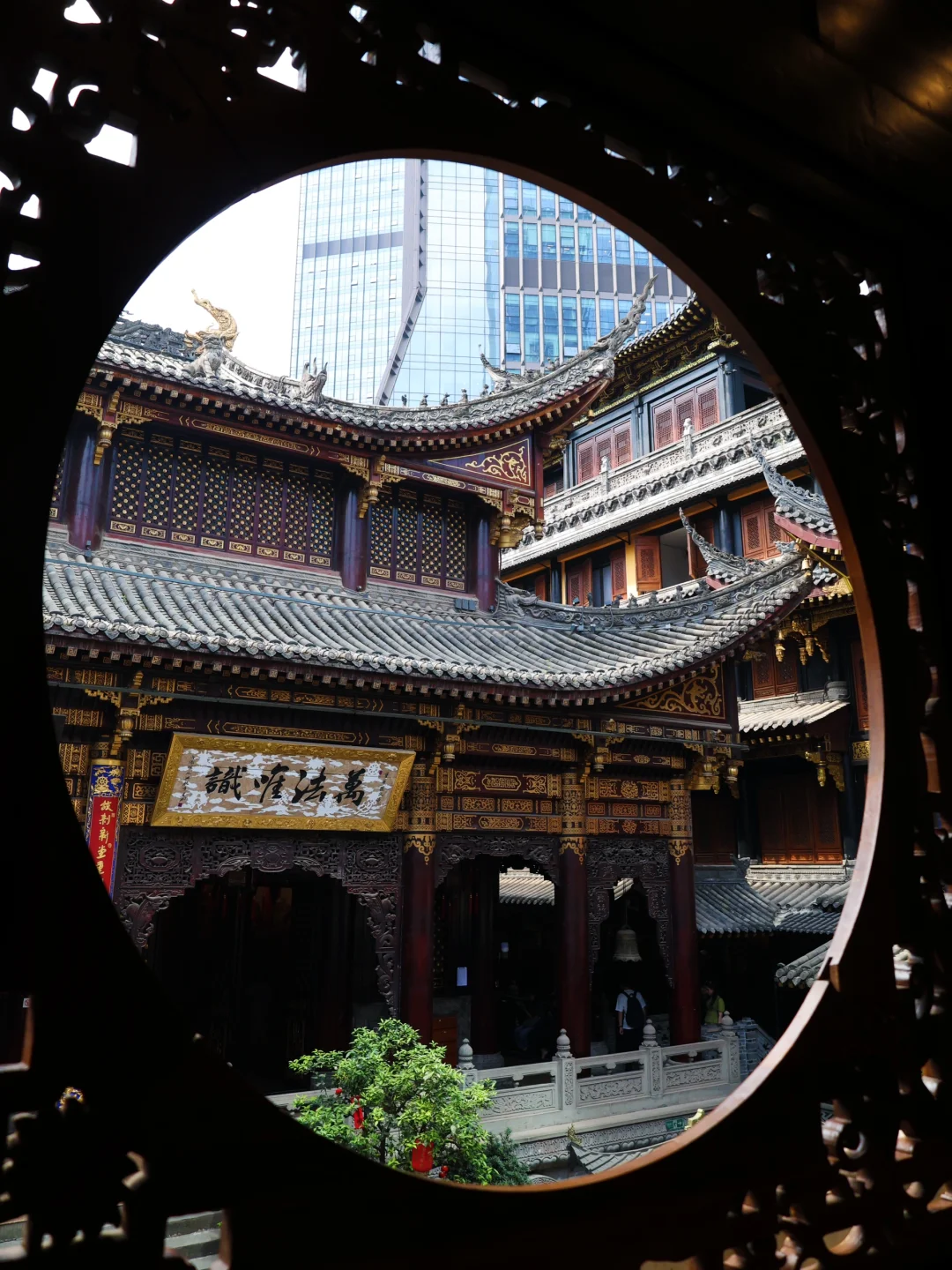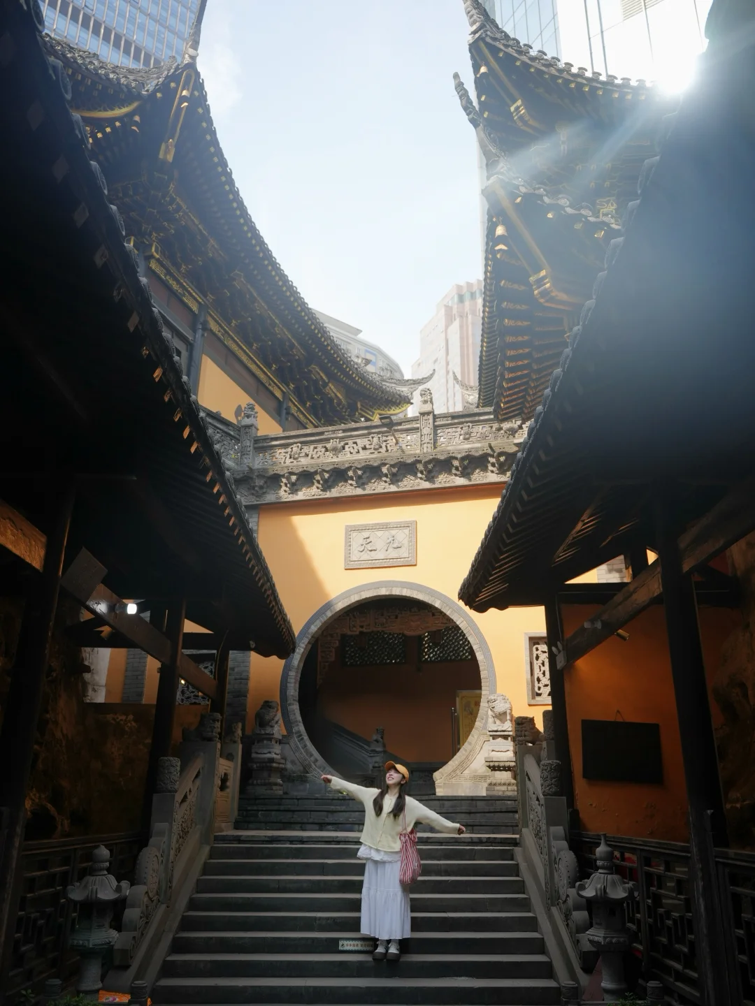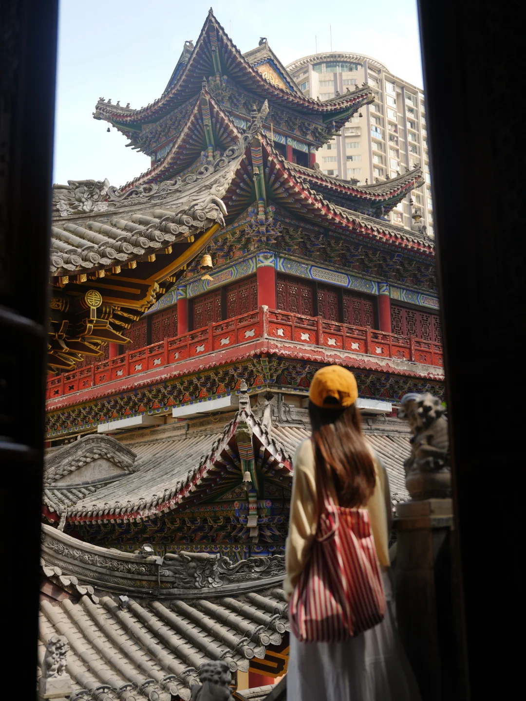 低机位仰拍,把寺庙飞檐和背后联合国际大厦同框,古代与现代相结合!
