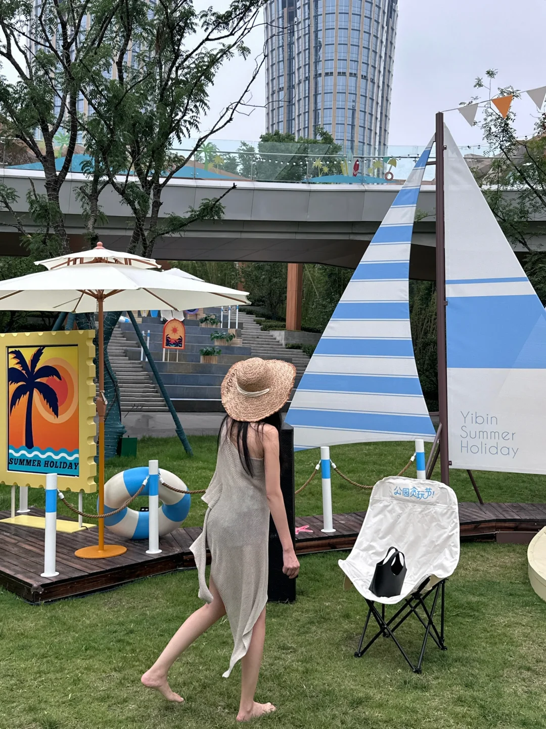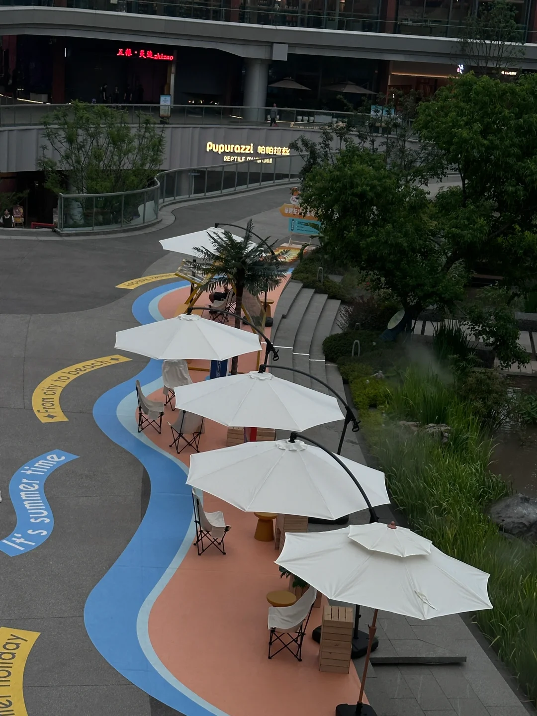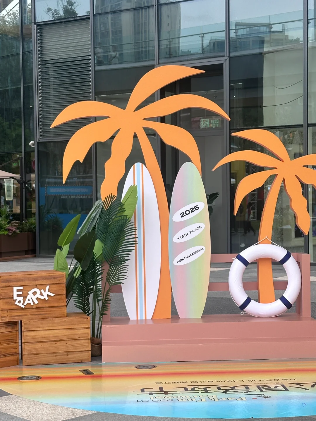 是谁说宜宾没有文艺市集?! 万象宜宾天地E·PARK宜公园中庭变身「夏日海滩」,椰林+冲浪板+冰镇椰子,氛围感杀疯了~ 小朋友疯玩到拉不走! 海岛市集 拍照自带海风滤镜! ✨ 沙滩椅区感受“落日冰橙美式”🍹! 旋转楼梯俯拍全景🌴 . 📖新山书屋|冷气超足的避暑文艺岛!冲进书店,木质香+落地窗像钻进森林海! 🏠VITA CAFE 维她|漂亮饭~嘎嘎出片!