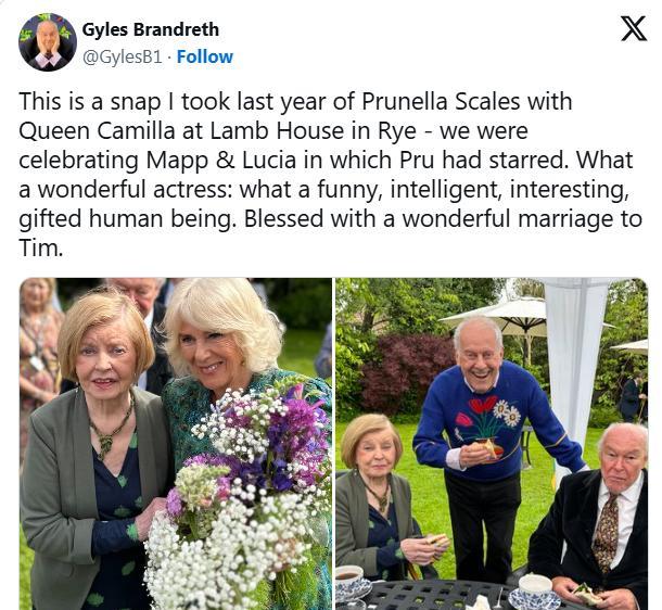 卡米拉王后与《弗尔蒂旅馆》传奇女演员的最后一聚,感动全网! 一场跨越王室与平民的温暖邂逅,成为英国喜剧传奇生前最珍贵的记忆。 五月的英格兰莱姆别墅花园,阳光正好。 2024年的这个午后,英国王后卡米拉放下王室身份,与93岁的国宝级女演员普鲁内拉·斯凯尔斯并肩而坐,两人脸上洋溢着如老友重逢般的笑容。 谁能想到,这组由英国作家吉尔斯·布兰德雷斯在社交媒体上分享的温馨照片,竟成为了这位《弗尔蒂旅馆》中“西比尔”扮演者生前最后与王室同框的珍贵瞬间。 “这是一张我去年拍摄的普鲁内拉·斯凯尔斯与卡米拉王后在莱姆别墅的合影。”布兰德雷斯在推文中动情地写道,“我们当时正在庆祝《马普与露西亚》——普鲁曾出演的剧集。多么出色的演员,多么风趣、聪明、有趣、天赋异禀的人。她与蒂姆的婚姻也非常幸福。” 照片中,卡米拉王后身着优雅的蓝色连衣裙,完全没有王室的架子,而是像一位真诚的粉丝,专注地聆听着普鲁内拉的每一句话。 而普鲁内拉则穿着精致的套装,戴着珍珠项链,尽管年事已高,却依然保持着那份特有的睿智与风度。 这场在莱姆别墅举行的花园派对,原本是为了庆祝普鲁内拉辉煌的职业生涯以及对英国电视和电影的持久影响。 谁能想到,这竟成了她与公众告别的序曲。 对全球观众而言,普鲁内拉·斯凯尔斯最深入人心的角色莫过于在BBC经典情景喜剧《弗尔蒂旅馆》中饰演的“西比尔·弗尔蒂”——那位精明干练、经常翻白眼的旅馆老板娘。 她那独特的笑声和犀利的眼神,成为了整整一代英国喜剧的象征。 但她的艺术成就远不止于此。 从《巴西来的男孩》到《霍华德庄园》,从《孤独的朱迪思·赫恩的激情》到《一场大冒险》,普鲁内拉的演艺生涯横跨数十年,角色多变且深入人心。 1992年,她因在艾伦·班尼特的舞台剧《归属问题》中饰演伊丽莎白二世而获得BAFTA(英国电影电视奖)提名,展现了她在戏剧舞台上的同样出色的演技。 在《马普与露西亚》和《七分之一》等系列剧中,她也留下了令人难忘的表演。 而普鲁内拉与已故丈夫蒂莫西·韦斯特的爱情故事,更是英国艺术界传颂的佳话。 两人于1963年结婚,共同走过了半个多世纪的风风雨雨。 他们不仅在1987年的闹剧《管家看到了什么》中同台演出,还共同主持了旅游纪录片系列《伟大的运河之旅》。 在普鲁内拉与痴呆症作斗争的岁月里,蒂莫西一直是她坚强的后盾。 蒂莫西曾在2024年去世前谈及支持普鲁内拉与疾病抗争的经历,展现了这对艺术伉俪相濡以沫的深情。 卡米拉王后与普鲁内拉的这次会面,超越了普通的王室活动,成为了一次真正的文化传承的见证。 作为英国王室的高级成员,卡米拉一直积极支持艺术和文化领域,而这次与普鲁内拉的互动,更是展现了她对英国文化偶像的真诚尊重和欣赏。 在派对现场,卡米拉不仅与普鲁内拉亲切交谈,还认真聆听了她对艺术生涯的分享,这种平等的交流让在场的所有人都感到温暖。 “多么出色的演员,多么风趣、聪明、有趣、天赋异禀的人。”布兰德雷斯在推文中这样评价普鲁内拉,“她与蒂姆的婚姻也非常幸福。” 这些话语如今读来,更显得珍贵而感人。 普鲁内拉离世的消息传出后,这组照片在社交媒体上被疯狂转发,无数网友被这段王室与平民艺术家的温情互动所打动。 一位网友留言道:“看到卡米拉王后如此真诚地尊重和欣赏我们国家的文化偶像,真的很感动。这不仅仅是王室职责,更是发自内心的尊重。” 正如一位评论者所说:“在这个瞬间,没有王室与平民的界限,只有两个伟大的英国女性,在阳光下分享对艺术和生活的热爱。” 斯人已逝,但普鲁内拉·斯凯尔斯留下的笑声和温暖,将如那个五月的阳光一样,永远留在人们心中。 关注【全球奇趣娱乐八卦】,解锁更多王室与明星的温暖瞬间!