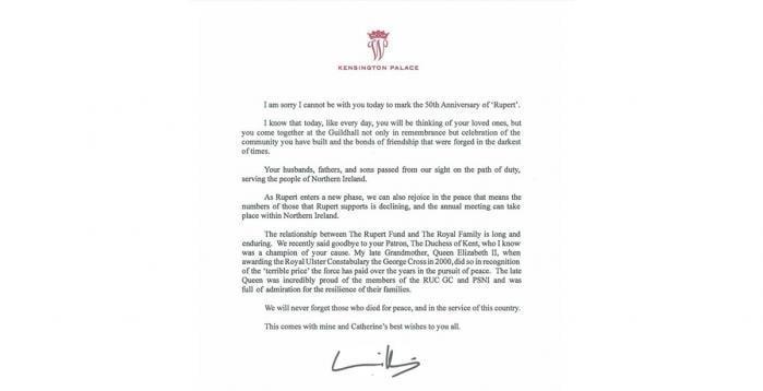 威廉凯特亲笔信致敬“鲁珀特基金”50年传奇,字里行间藏感人深意! 当英国皇室的蓝底御用信笺缓缓展开,一段跨越半个世纪的温情故事在世人面前徐徐铺陈。 近日,威廉王子与凯特王妃虽未能亲临鲁珀特基金50周年庆典现场,却用一封满载真情的手写信件,让这个致力于北爱尔兰儿童与青少年发展的慈善组织收获了最珍贵的金色周年贺礼。 “我们永远不会为和平献身、为这个国家服务的人们。” 这掷地有声的誓言,伴随着剑桥公爵夫妇的诚挚祝福,通过社交媒体传遍世界。 在信中,皇室夫妇不仅盛赞该基金会在教育、社区发展和艺术领域的卓越贡献,更以细腻笔触追忆了刚离世的基金会长期赞助人肯特公爵夫人。 字里行间,我们看到的不仅是皇室成员履行公务的庄重,更是三代人对慈善事业薪火相传的动人传承。 成立于1975年的鲁珀特基金,恰如北爱尔兰和平进程的缩影。 最初为抚恤北爱尔兰警察遗孀与母亲而设,这个组织在时代洪流中不断蜕变——从最初的抚慰伤痛,到如今通过艺术教育为青少年插上梦想翅膀,用社区建设缝合历史裂痕。 正如他们在信中强调的“适应不断变化的需求”,基金会的转型本身就是一部动人的社会进化史。 在隆重的50周年庆典上,伦敦市警察联盟派出仪仗队执礼护卫。 这个细节背后,藏着更深的感动:当年那些失去亲人的警属们,如今已从受助者成长为助人者。 这种跨越代际的守望相助,正是北爱尔兰从创伤走向重生的最佳见证。 威廉王子的这封信,延续了戴安娜王妃“慈善要触及真实生活”的理念,也展现了现代皇室更接地气的慈善哲学。 当基金会志愿者带着艺术课程走进贝尔法斯特的社区中心,当年轻人在音乐工作坊里找到人生方向,皇室的支持不再是遥远的象征,而是化作了改变命运的真实力量。 这场跨越半个世纪的温情接力,让我们看到:真正的慈善不是施舍,而是携手同行;皇室的责任不仅是传承传统,更是点燃希望。 正如威廉凯特在信中所传递的——最动人的致敬,是让每个善举都成为照亮未来的星光。