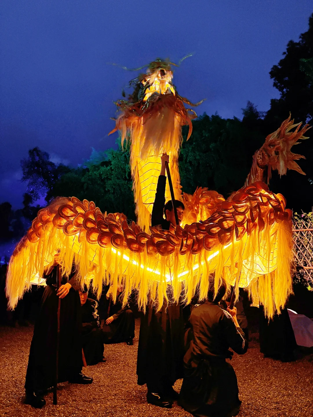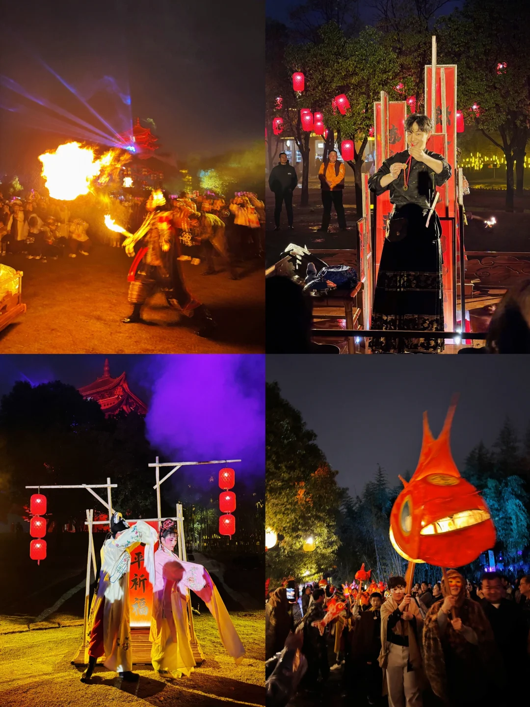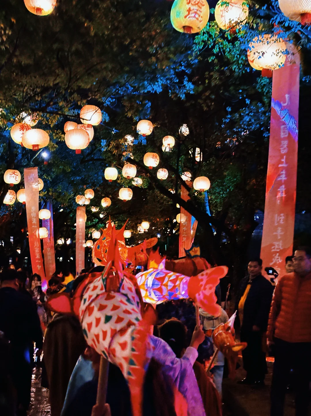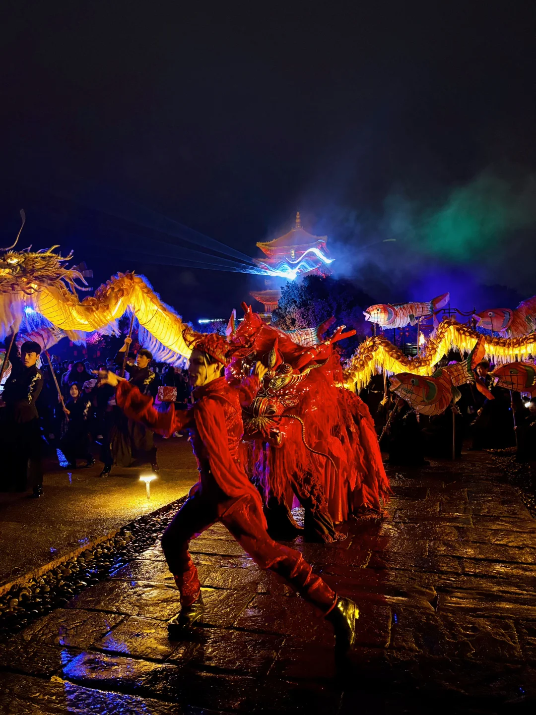 夜幕降临庙会重头戏也开始了,在龙珠阁门口的草坪上,篝火点燃的刹那,鱼灯破开雨幕,麒麟踏火而来,龙灯缠绕着祝祷的舞蹈,千年前的"凤箫声动,玉壶光转,一夜鱼龙舞"突然攻占了我的泪腺...这浪漫至死的民俗美学。