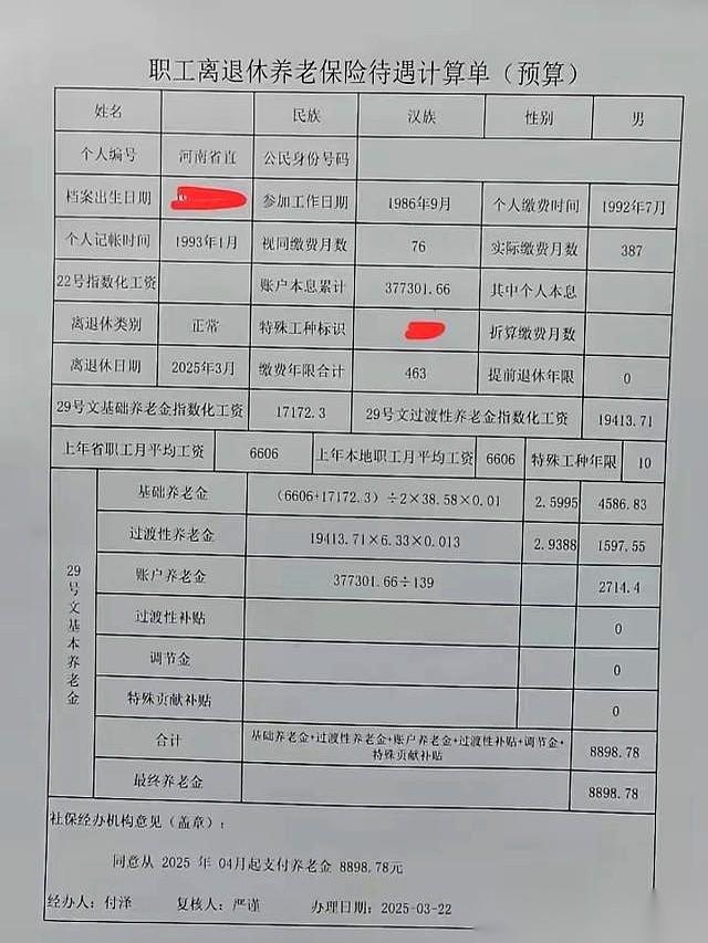 刷到一个河南大哥的养老金单子,给我看愣了。 退休金,8898块。你没看错,坐标河南。 工龄38年多,个人账户里躺着37万多。 我第一反应是,这数字,不像真的。 再一看,更扎心的来了。人家是特殊工种,本来55岁就能退。 硬是多干了5年,60岁才退。 我要是能55退,我一天都不多干,蹦着迪就回家了。 图啥呢?多干这五年,每个月养老金活生生多出来一千多块。一辈子的一千多块。 看到这儿我才明白,人跟人的差距,从年轻时就拉开了。 别一天到晚抱怨哪个地方基数低。这大哥所在的河南,基数在全国都算偏低的。 那钱是哪来的? 人家全程缴费指数2.6! 这是什么概念?就是人家没按最低标准交,而是顶着社平工资两倍半的档次在交。交了快四十年。 很多人,包括我自己,年轻时总想着,哎呀随便交交得了,按最低的来,反正都有。 省下来的钱,吃了喝了玩了,当时是挺爽。 现在懂了。 你年轻时对养老金爱答不理,它晚年就让你高攀不起。 这哪是退休金啊,这是人家用38年远见和自律,下的一盘大棋。 棋局的收官,叫“体面”。 服了,真的服了。