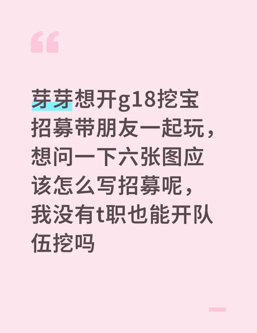 如图! 芽芽想开g18挖宝招募带朋友一起玩,想问一下六张图应该怎么写招募呢,我没有t职也能开队伍挖吗 大概是多少金币一个人呢?四个人可以挖吗?需要奶妈吗?需要开成就位置吗?好像都不是很清楚库啵!ff14