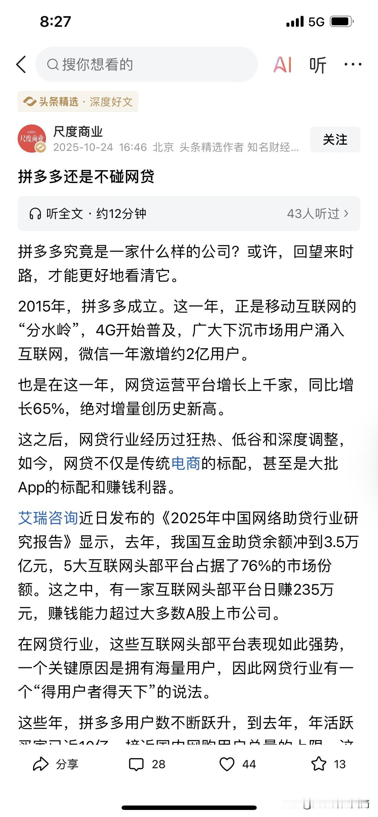 拼多多不碰网贷,就凭借这一点,我就觉得拼多多的老板一定是人间清醒:网贷来钱快,副作用是让年轻人深陷短期高利率债务陷阱,而且债务越来越大必然是越来越多的违约。专注自己的事情才能做好自己的事业。