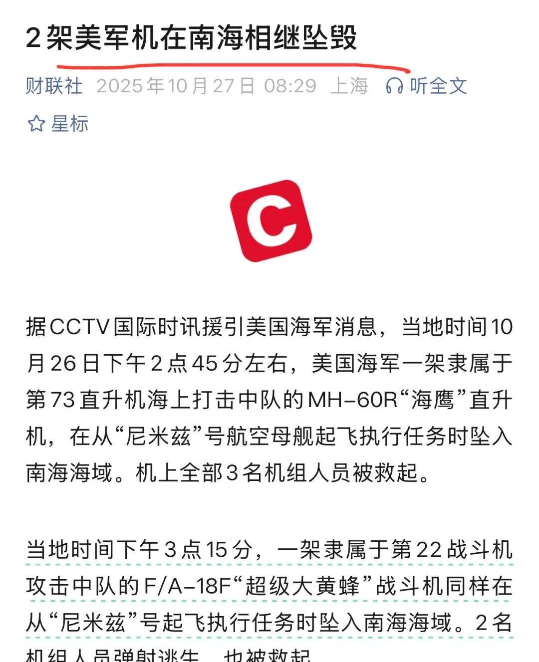 财联社:两架美军机在南海坠毁 如图,财联社最新报道 不过,两架军机,机组人员全部获救