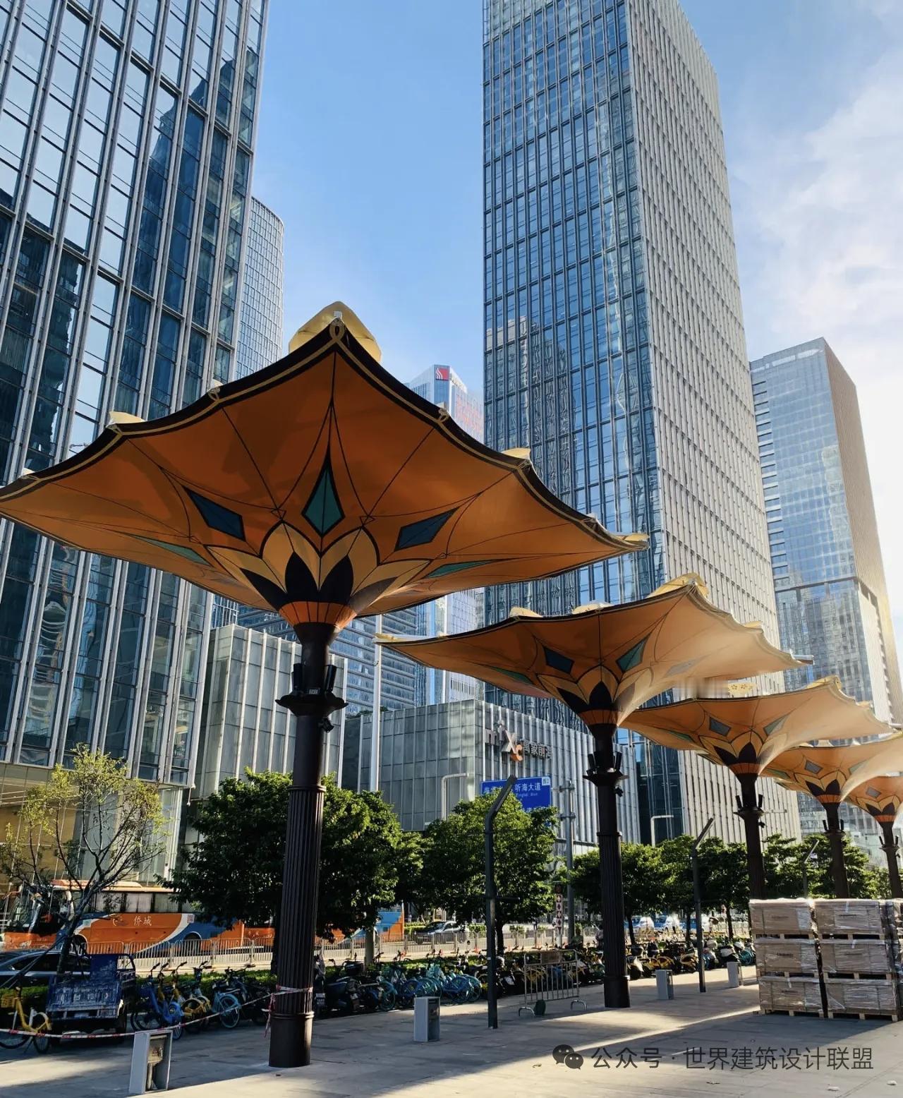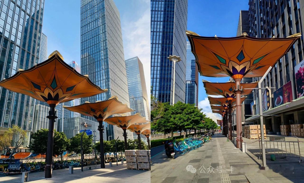 深圳前海巨型天幕伞:复刻沙特黑科技,解锁赛博城市新景观 因独特设计走红国际的沙特遮阳伞,如今在深圳前海交易广场迎来“升级版”——14把巨型天幕伞不仅复刻了前者的“变形”巧思,更结合本地需求实现功能创新,成为市民打卡新地标。 沙特遮阳伞由德国团队设计,40米高、16吨重的聚四氟乙烯伞面,兼具耐高温、抗紫外线与冬夏温控功能。而深圳天幕伞选用航空级PTFE膜材,能隔绝95%紫外线并抵御14级大风,更暗藏巧思:伞骨每1米设冷雾喷头,每日10-18点每半小时喷雾,可让伞下温度直降5℃;从闭合到完全展开仅需3分钟,速度比沙特同款快近一倍。 夜幕降临后,天幕伞更切换“露天小剧场”模式:氛围灯亮起配合轻音乐,为广场增添浪漫科技感。这一设计也契合深圳“赛博之城”的气质——此前智能石墩子、公园无人驾驶观光车、无人机送餐等科技设施,早已让这座城市的日常充满未来感。