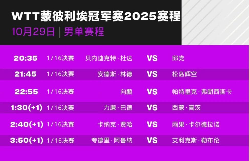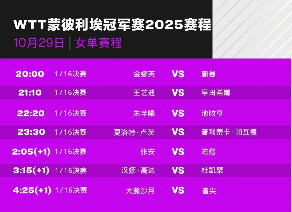 10月29日赛程丨蒯曼、王艺迪、陈熠、向鹏出战! 蒙彼利埃冠军赛 比赛进行到第二天,今天继续首轮比赛! 国乒赛程如下: 1️⃣女单: 20:00 蒯曼vs金娜英 21:10 王艺迪vs早田希娜 02:05 陈熠vs张安 2️⃣男单: 22:55 向鹏vs弗朗西斯卡 昨天国乒三场比赛全部告负,男单陈垣宇1比3不敌张禹珍,温瑞博1-3不敌吴晙诚;女单陈幸同0比3不敌斯佐科斯! 今天四场比赛,国乒向鹏、王艺迪遭遇硬战,向鹏将与德国主力弗朗西斯卡对垒,后者相当有实力,在五局三胜的比赛里,向鹏要率先发动,打出自己的技战术,压制对手发挥!王艺迪与早田希娜历史交手也没有太多优势,早田希娜在上周的伦敦球星挑战赛获得亚军,还是表现相当稳定,王艺迪要打出自己进攻的高质量! 国乒加油!