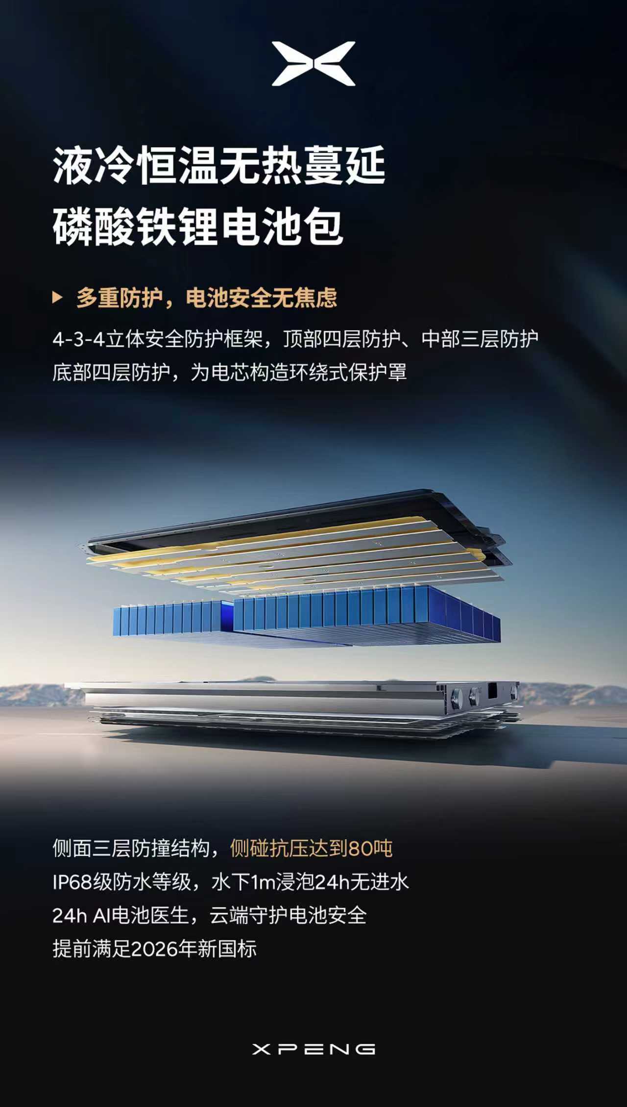 全车标配 9 个安全气囊,搭配液冷恒温无热蔓延磷酸铁锂电池包 + 4-3-4 立体防护 + IP68级防水 + AI 24h 电池医生+提前满足 2026 新国标,全域守护乘员安全。