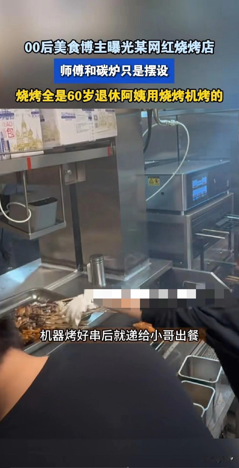 现在的烧烤店也是装模做样, 明明是机器考的, 他非说是人工考的, 厨房里面雇佣60岁阿姨用机器烤串, 烤完后交给师傅, 在假装在烤炉上面烤一下, 然后放到盘子里面递给顾客, 在外面看明厨明灶, 人工现烤现卖, 实际都是在那里表演! 这还是网红烧烤店, 这一天得接待多少顾客, 有多人被忽悠了还夸人家现烤现卖, 现在的餐饮店还真是暗度陈仓, 把顾客当猴耍了! 网友表示这样的网红店铺就要曝光! 大家对于这样表演式的网红烧烤店怎么看? 抖音美食 烧烤店工作 招远烧烤师 模拟烧烤摊 王烤师自助烤串