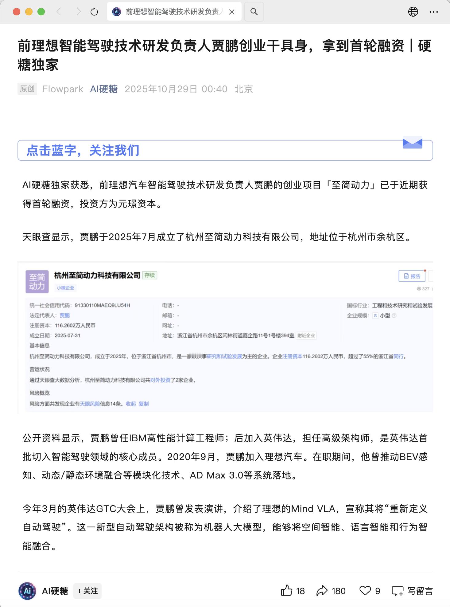 AI 硬糖:前理想汽车 AD 研发负责人(离职前 title 应该到 VP 了)创办至简动力,前理想汽车 CTO 王凯也加盟了。