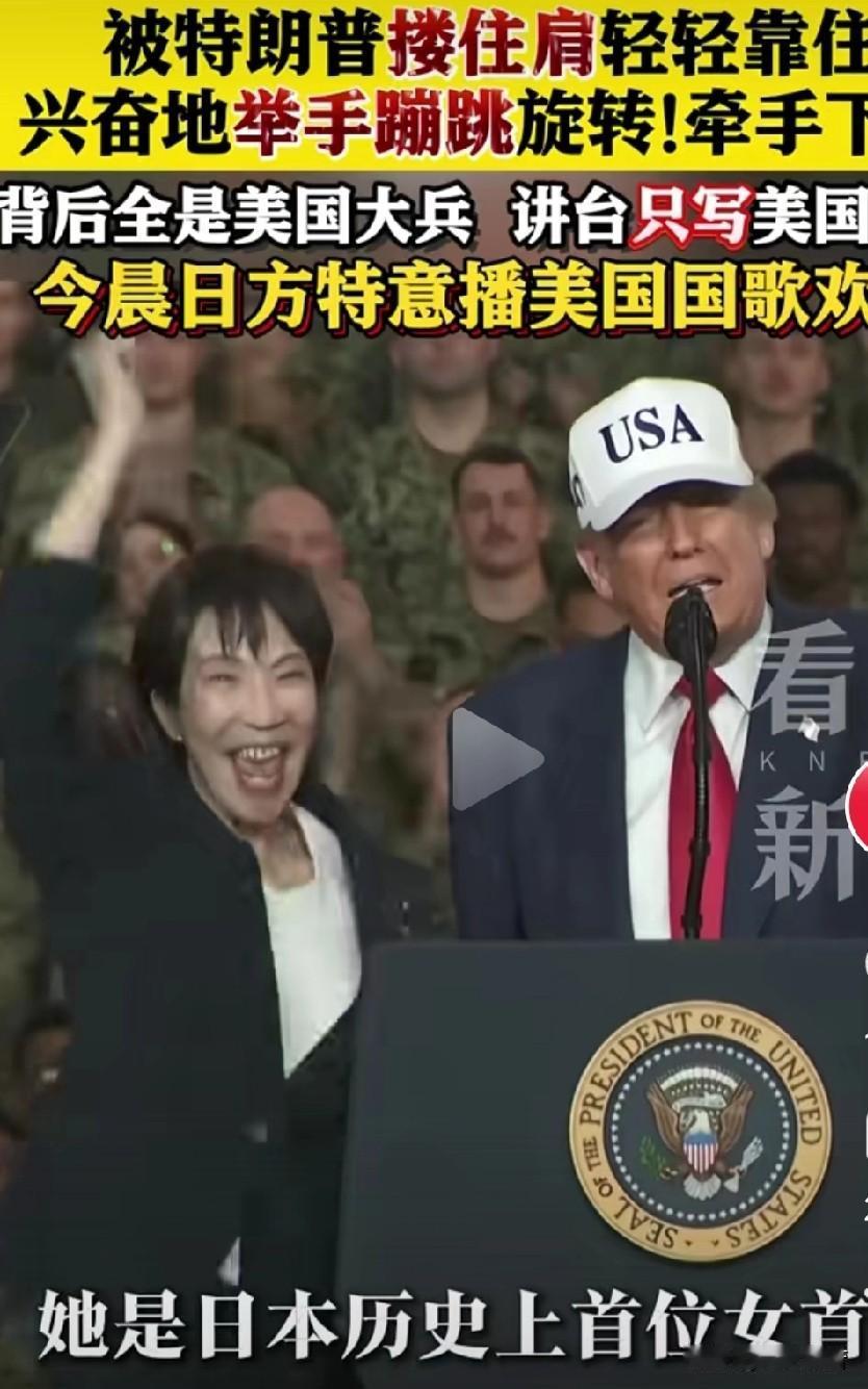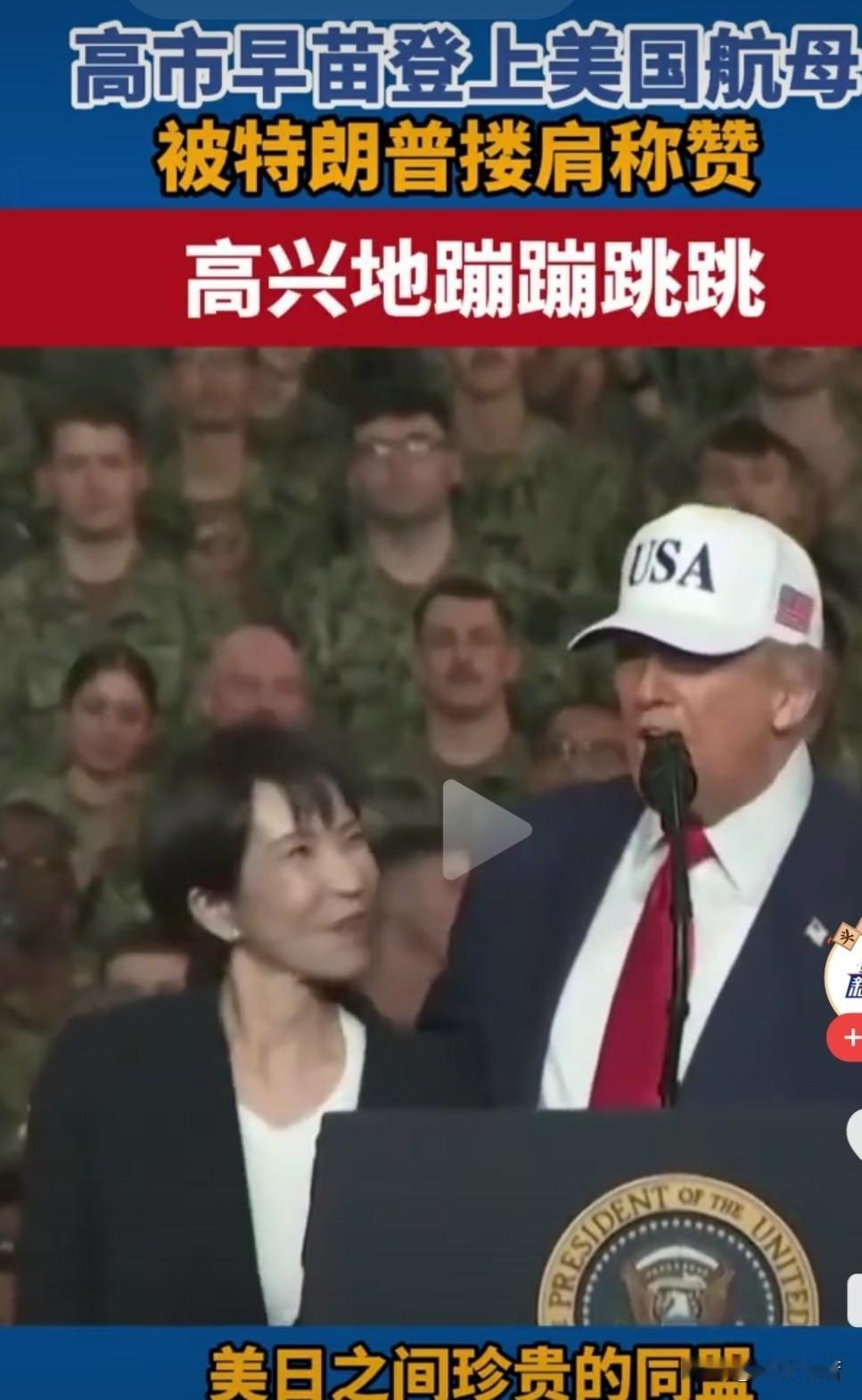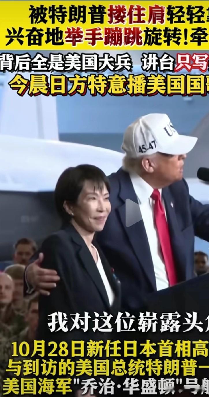 看高市早苗那崇拜的小眼神! 登上美国航母,把她高兴的连蹦带跳的,好像个大型追星现场。等下去小心点,连滚带爬可就有失颜面了! 特朗普激动地说,她是“伟大的首相”“她是赢家”“我们突然就成了最亲密的朋友!”怎么就这么突然呢?看把这位女首相高兴的,还送安倍晋三使用过的高尔夫球杆和金球。 知小礼而无大义,拘小节而无大德的民族,一副奴颜婢膝的样子。对美太痴心妄想了吧,自己实力不强大,总有被抛弃的时候!
