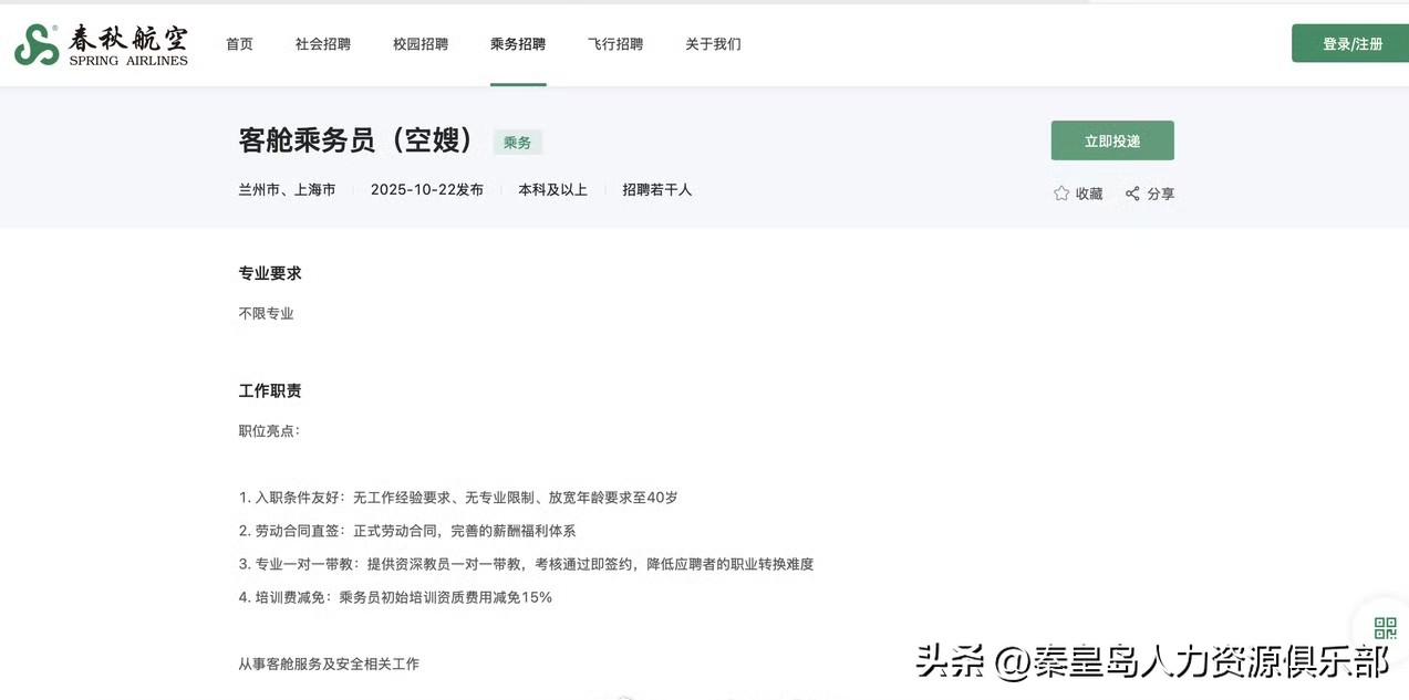 【从空姐到空嫂,这波操作太狠了,直接打脸职场年龄歧视!】 春秋航空在兰州招“空嫂”的新闻,我第一反应是:这航空公司胆儿挺肥啊!直接把空姐年龄放宽到40岁,还专门要已婚已育的!以前空姐不都是20来岁的小姑娘吗?现在40岁大姐也能飞,这变化也太大了吧! 有人说,这不就是普通招聘吗?有啥大不了的?可你仔细想想,多少行业、多少公司,招聘时明里暗里卡年龄、卡身高?35岁以上的简历直接扔垃圾桶,160cm以下的姑娘连面试机会都没有。企业说这是“岗位需求”,可真要较真儿,有多少岗位是真离不开年轻小姑娘?又有多少是老板自己看着顺眼? 这次春秋航空敢招40岁空嫂,我得给他们点个赞!人家说了,已婚已育的女性更稳定,带小孩的经验能更好地服务乘客,处理突发情况也更冷静。这话没毛病啊!空乘这工作,说到底拼的是服务、是应变能力,又不是选美比赛,非得20岁小姑娘才能干? 但咱们往深了想,春秋航空为啥突然愿意招大龄空乘?除了她们确实有优势,更重要的可能是——企业算明白了账! 你想啊,招20多岁的空姐,漂亮是漂亮,可人家干几年结婚生子,婚假、产假、哺乳假一休,企业得额外掏钱养着,社保还得照交。更别说年轻员工流动性大,干几年跳槽了,企业还得重新招人培训。而40岁的空嫂呢?孩子都上中学了,家庭稳定,心思更踏实,跳槽概率低,企业省心又省钱! 所以啊,这哪是什么“善心”放宽年龄?根本就是企业算经济账算明白了!以前卡年龄、卡身高,表面上是“岗位需求”,实际上是为了节省成本、减少麻烦。可现在呢?人口红利没了,年轻人越来越少,企业再挑三拣四,连人都招不齐了! 我早就说过,除了极少数特殊岗位(比如飞行员对身高视力有硬性要求),其他工作凭什么非要卡年龄、卡身高? 35岁以上的程序员不能写代码?40岁的销售不能谈生意?50岁的工程师不能搞技术?这些岗位和年龄、身高有一毛钱关系? 春秋航空这事儿,算是给职场年龄歧视狠狠来了一巴掌!希望更多企业学学,别再拿“年轻漂亮”当招聘门槛,真要比,比能力、比经验、比稳定性! 最后说句实在的:年龄不是问题,能力才是关键! 40岁的空嫂都能飞,你还有什么理由被职场淘汰?