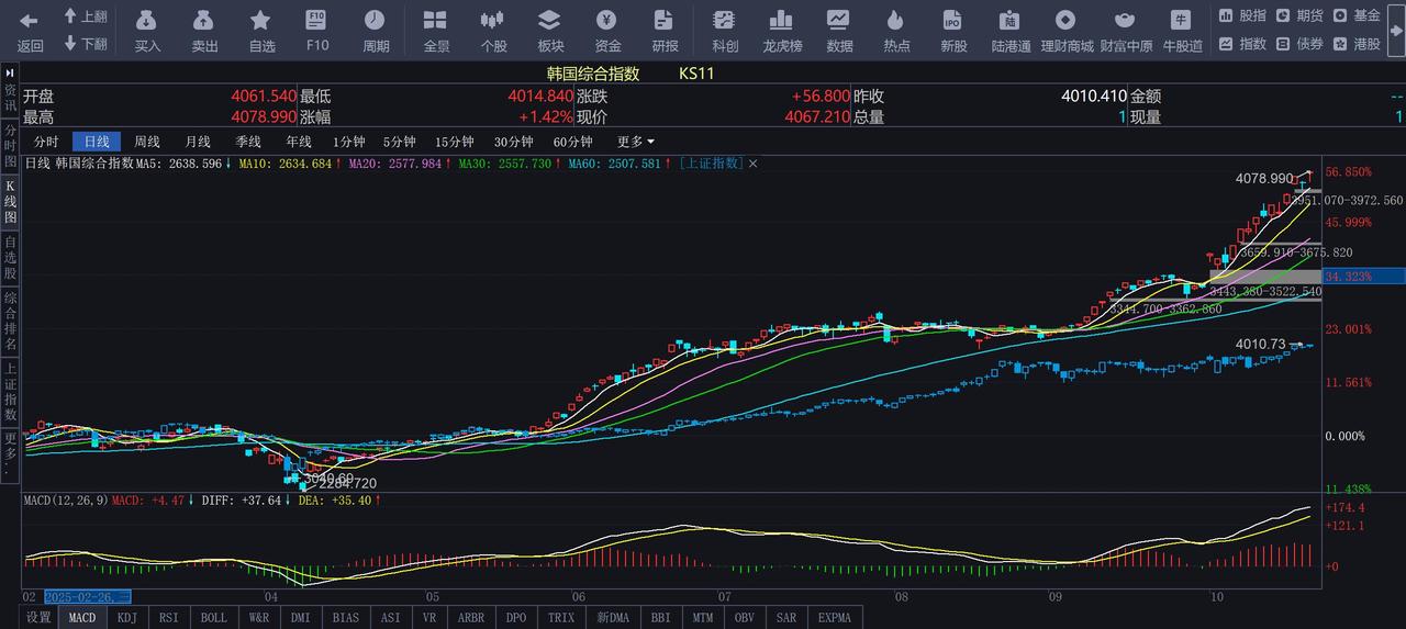 【韩国股市指数超越A股!】今日韩国汉城综合指数最高达4078点,已超越了上证指数,如果从今年的绝对涨幅来看,也超过了A股指数。(下图是两国指数对比)