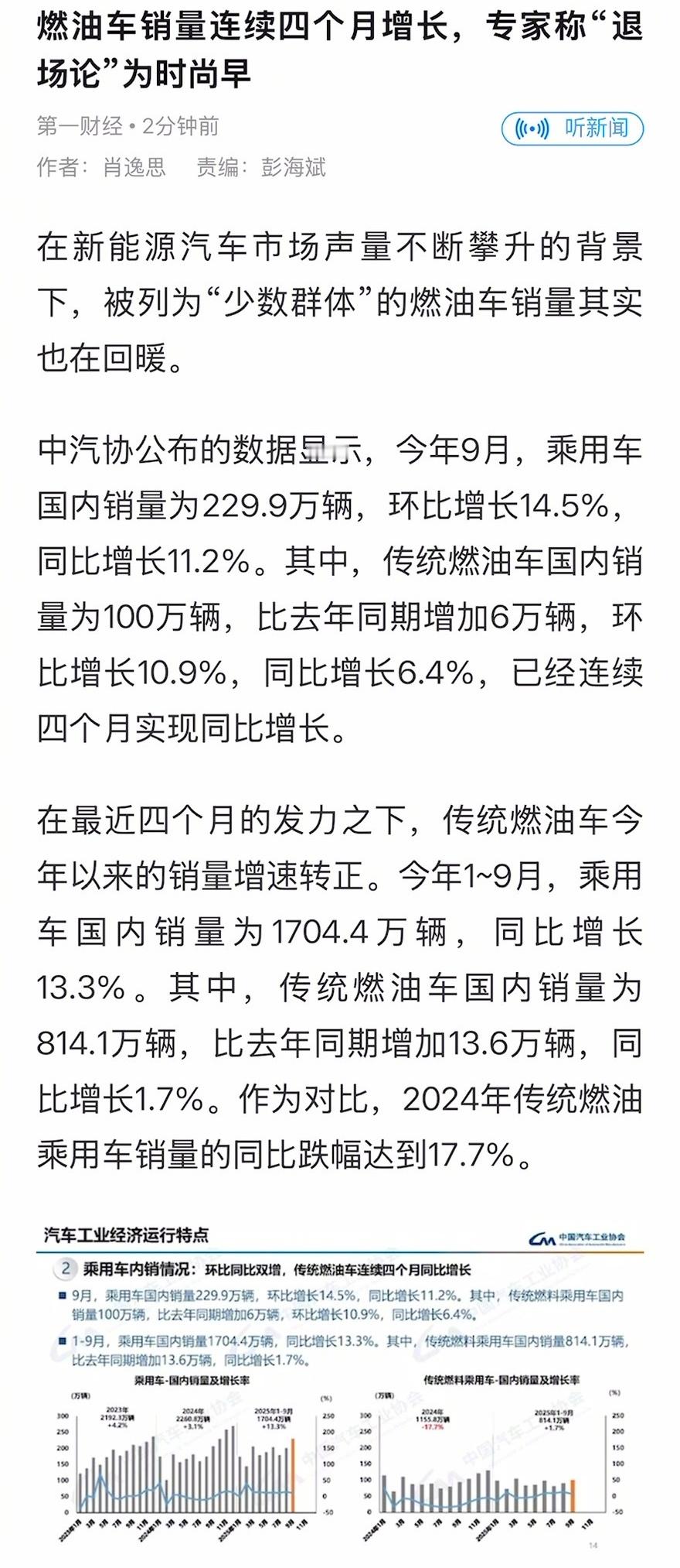 专家称燃油车退场论仍为时尚早燃油车销量连续四个月增长在新能源汽车市场声量不断攀升的背景下,传统燃油车也在悄悄逆袭