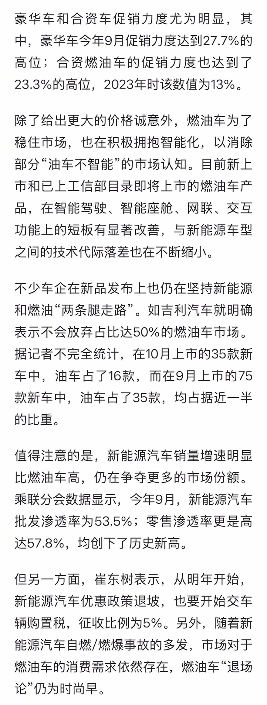 今年9月,传统燃油车国内销量为100万辆,比去年同期增加6万辆,燃油汽车销量连续四个月在涨