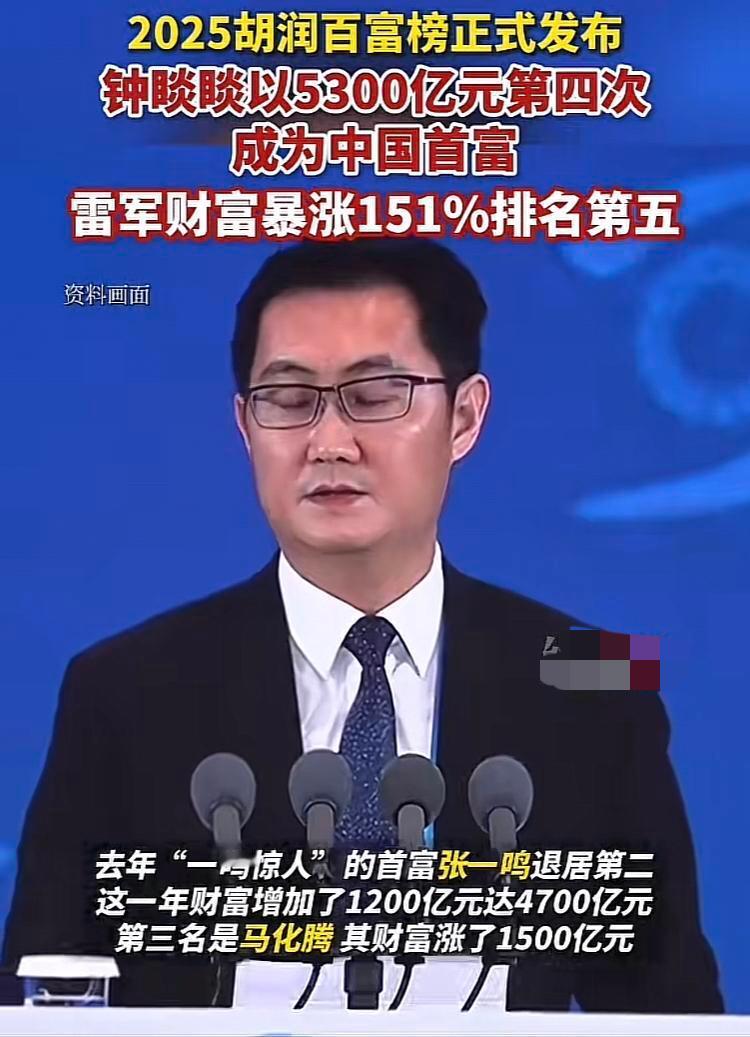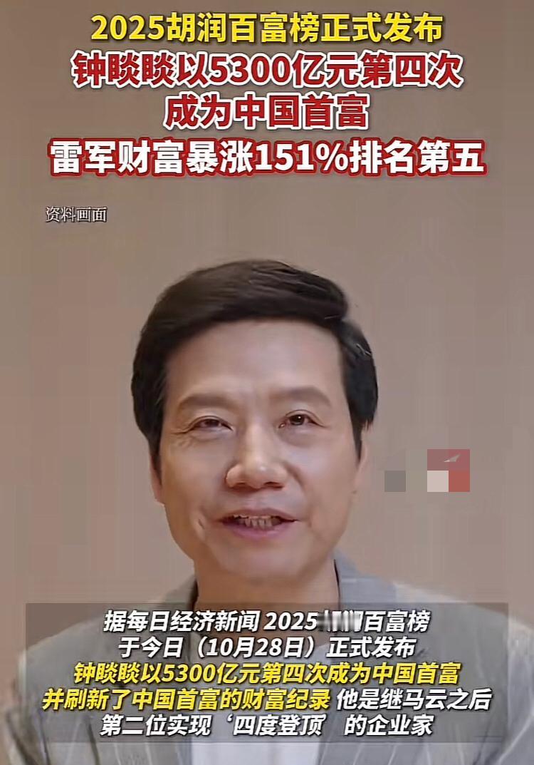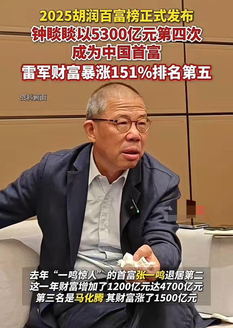 中国首富:钟睒睒。4次登顶中国首富宝座。张一鸣的排名下降了,目前位列第二。雷军目前暂列第5。而马云已经跌出前10。今年是钟睒睒第四次成为首富,数量和马云一样。马云也是曾四次成为首富。马云现在退居二线,其财富页缩水了。