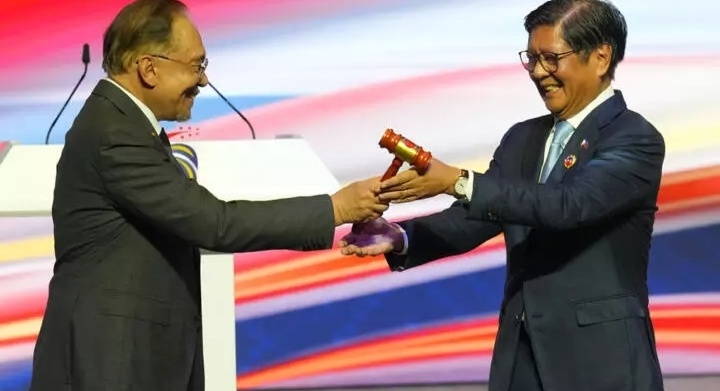 周二(28日),马来西亚总理安瓦尔在吉隆坡会议中心举行的第47届东盟峰会及相关会议闭幕式上将轮值主席国木槌移交给菲律宾总统马科斯,标志着菲律宾正式担任2026年东盟轮值主席国。