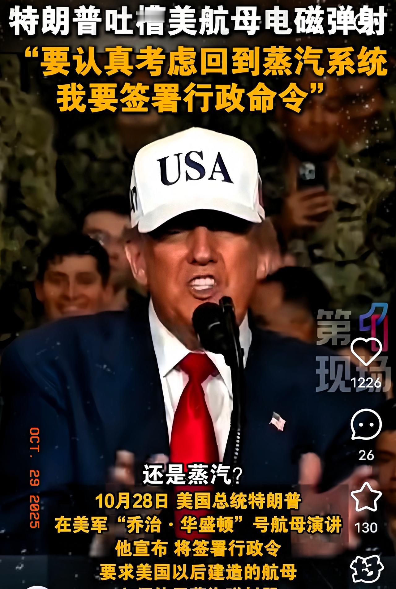 特朗普在驻日美军横须贺基地的“华盛顿”号航空母舰上高声宣称:“我非常懂造船,没有人比我更懂航母!与电磁弹射相比,蒸汽弹射已经可靠运行了50年,性能更稳定,维护也更简单。” 他随即转向舰上官兵发问:“你们觉得蒸汽弹射和电磁弹射哪个更好?”现场响起整齐划一的回应:“蒸汽弹射!”特朗普当即拍板,称将签署行政令,要求未来新建航母全部采用蒸汽弹射器,以顺应官兵诉求。 话音刚落,他拿起话筒进一步抨击:“电磁弹射就是愚蠢荒唐的发明,花了近10亿美元却故障不断,而蒸汽弹射用锤子和喷灯就能修好。”这番表态并非首次,此前他就多次吐槽福特级航母的电磁系统,直言其“多花数亿却毫无作用”。 据悉,福特级电磁弹射器研发投入23亿美元,单套成本达7.8亿美元,是蒸汽系统的3.2倍,且2024年五角大楼报告显示,其平均无故障弹射仅600次,远低于设计目标的4000次。 然而现实给这一决策出了难题:美国唯一能生产蒸汽弹射器的企业已于2020年关闭生产线,重启需数十亿美元和数年时间。 更棘手的是,福特级舰体为电磁系统设计,改装蒸汽弹射需重新铺设数百米蒸汽管道,单舰改装成本或超百亿,还将导致后续航母交付延迟至2030年后。 讽刺的是,就在特朗普发声前一个月,中国福建舰刚完成歼-35、歼-15T和空警-600的电磁弹射起降,成为全球首个实现五代机舰上电磁弹射的国家。 福建舰的电磁弹射能量转化效率达60%以上,可适配2-70吨各类舰载机,连续弹射无冷却期,而蒸汽弹射能量效率仅4%-10%,连续弹射16分钟就需停机。 这一政策转向引发美军内部激烈争议:支持者认为蒸汽弹射能保障战备稳定性,反对者则指出其将让美国航母技术落后一代,错失无人机蜂群等新质战力。 这场“蒸汽与电磁”的博弈,不仅关乎千亿美元航母计划,更折射出大国军事技术路线的关键抉择。特朗普雷人言论