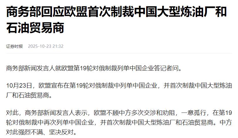 欧盟宣布,要将两家日产能合计达60万桶的中国炼油企业--辽阳石化和山东裕龙石化,以及中国石油的贸易部门中石油香港公司列入了对俄制裁名单。   这事欧盟公布的第19轮对俄制裁名单了,前18轮制裁下来,不仅没达到预想效果,自己反倒被能源供应、经济复苏等问题搞得焦头烂额。   可让人没想到的是,欧盟不反思自身策略,反而把气撒到了毫无关联的中国企业身上。   熟悉这三家企业的人都知道,它们一直是国际经贸里的“规矩人”,不管在哪个国家做生意,都严格照着当地法律来,跟欧盟所谓的“对俄违规”压根不沾边。   就拿日常运营来说,辽阳石化每天生产的炼化产品,大多是老百姓生活里离不开的塑料、化纤原料;山东裕龙石化从开工建设起,就把合规经营当成底线,所有流程都公开透明;中石油香港公司更是在能源贸易圈里以规范著称,打交道的都是全球知名企业。   而面对这一突如其来的制裁,我商务部当天就通过外交渠道作出了明确回应,态度坚决地表达了强烈不满和反对。   事实上,这种单边制裁和“长臂管辖”就是在破坏国际贸易的规矩,就像一条供应链上,你平白无故给中间环节设卡,最后整条链上的企业都会受影响,全球经济想复苏也会变得更难。   而这三家企业本来经营得好好的,辽阳石化的产品供应着全国不少民生工厂,山东裕龙石化还在为提升国内石化产业水平加班加点,中石油香港公司则保障着部分能源贸易的顺畅,它们的正常业务凭什么被政治因素搅和?   欧盟这种做法,说白了就是把中国企业当成了“出气筒”,根本解决不了它自己面临的问题。   回头看看,欧盟从2022年开始对俄实施制裁,一轮接一轮下来,欧盟内部的通胀压力没减轻,不少企业因为能源成本上升陷入困境,老百姓的生活也受到影响。在这种情况下,他们不琢磨怎么调整政策,反而盯上了和俄罗斯有正常贸易往来的中国企业。   可中国一直站在中立的立场上,俄乌冲突爆发后,咱们也没少劝双方坐下来谈,还坚持和包括俄罗斯和乌克兰在内的各国开展正常生意。   中国企业跟俄罗斯做买卖,都是按市场规则来的商业行为,买的是能源、卖的是商品,既不针对欧盟,也没违反任何国际准则,怎么就成了被制裁的对象?   现在全球经济都面临着供应链紧张、增速放缓的挑战,各国本该互相帮忙、一起应对,而不是动不动就搞制裁、设壁垒。我方已经明确说了,会采取一切必要措施,保护中国企业的合法权益不受损害。   同时也希望欧盟能醒醒,别再抱着冷战思维不放,零和博弈那一套早就过时了。停止滥用制裁,坐下来好好对话协商,才是解决问题的正道。