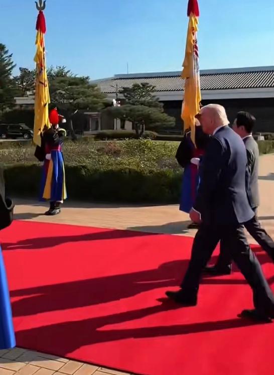 美总统出席韩国欢迎仪式,走在红毯上好似古代皇帝上朝,也太有面儿了吧!10月29日韩国为了欢迎远道而来的美总统,可谓是做足了准备。 首先红地毯铺到美总统的专车处;其次是夹道欢迎的人员都穿着古代传统服饰,手里还拿着笏板;再者红毯旁边还有穿着传统服饰的演奏人员,吹拉弹唱迎接贵宾的氛围感拉满。 从媒体曝光的照来看,站在红毯两边的迎接人员好似古代大臣,而俩总统先生走在红毯上就像古代皇帝或者国王,此时此刻可谓是风光无限。