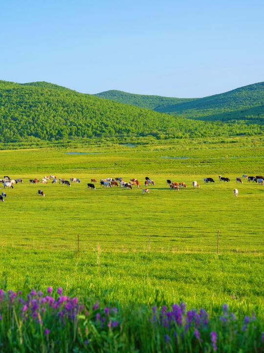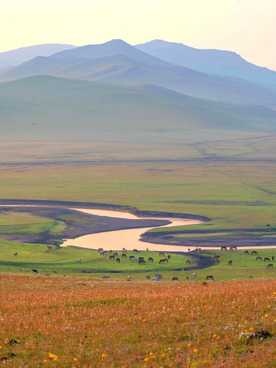 Herds of cows and sheep roam freely on the grasslands under the clear blue sky of the Morgele River