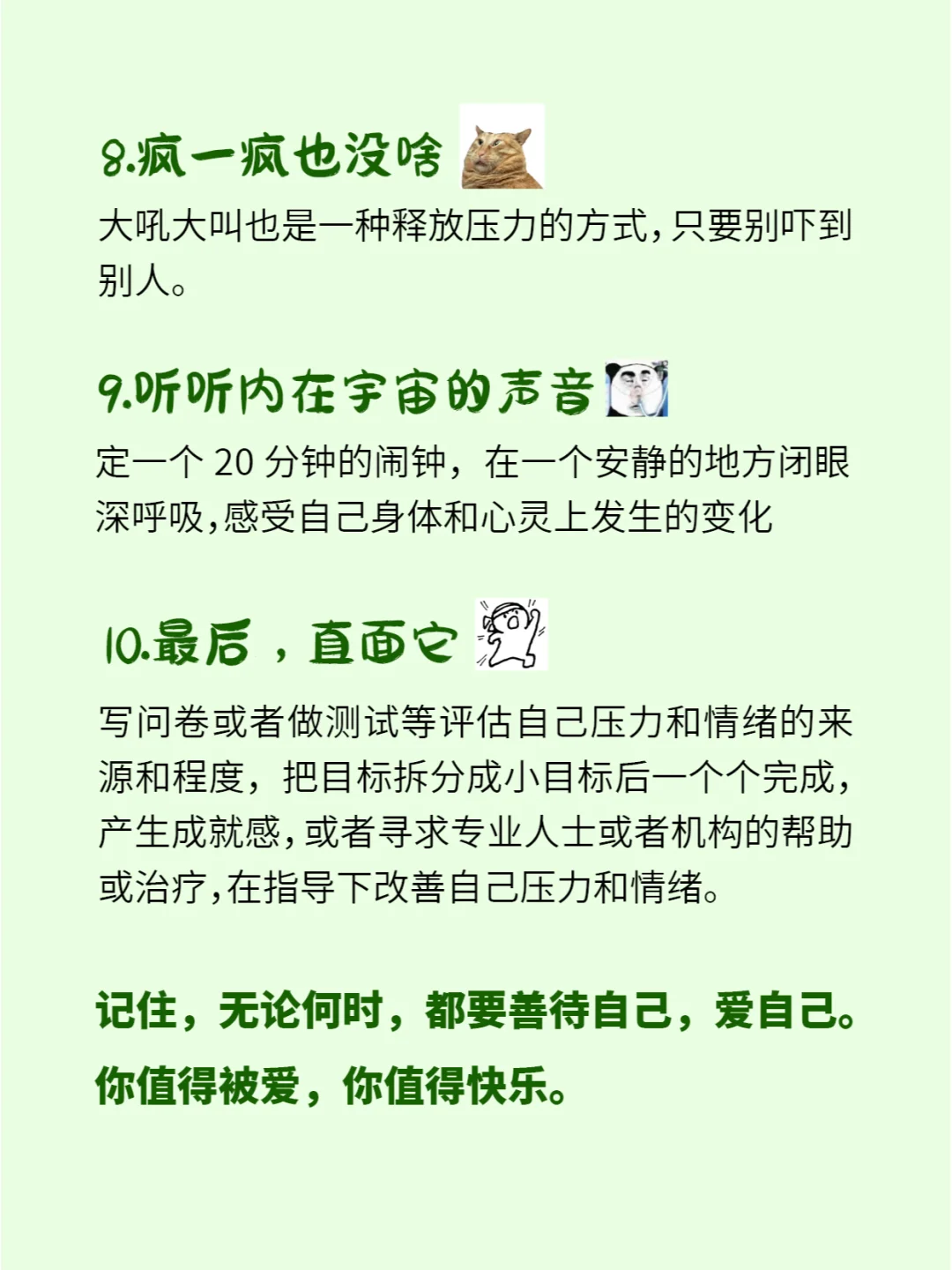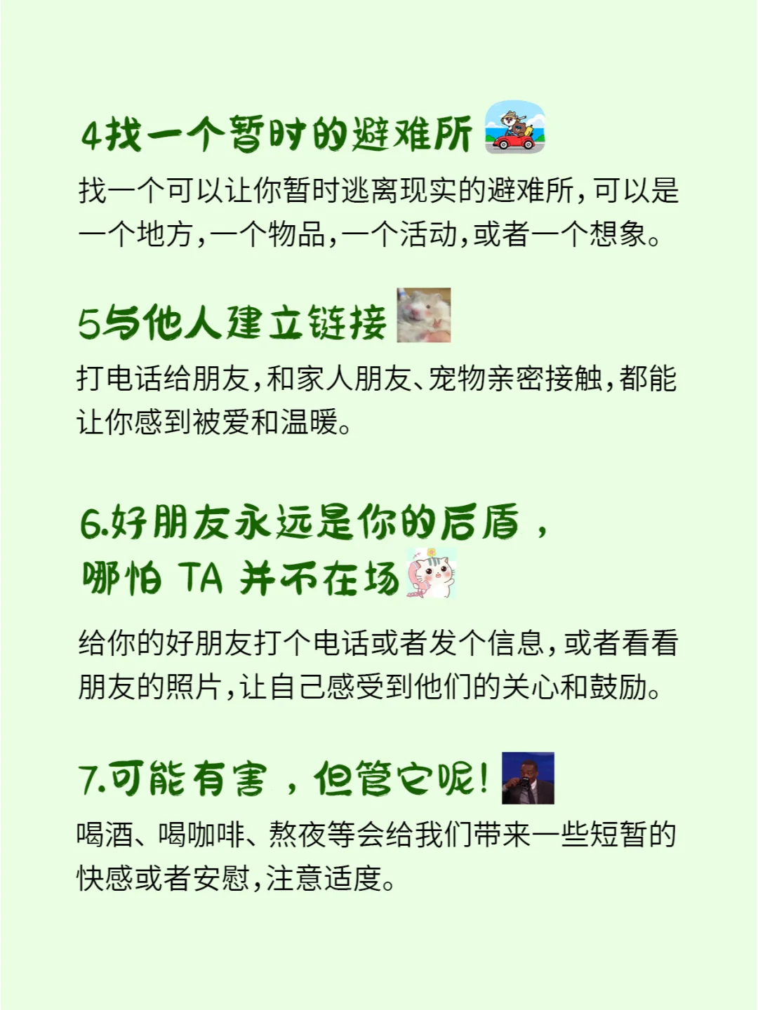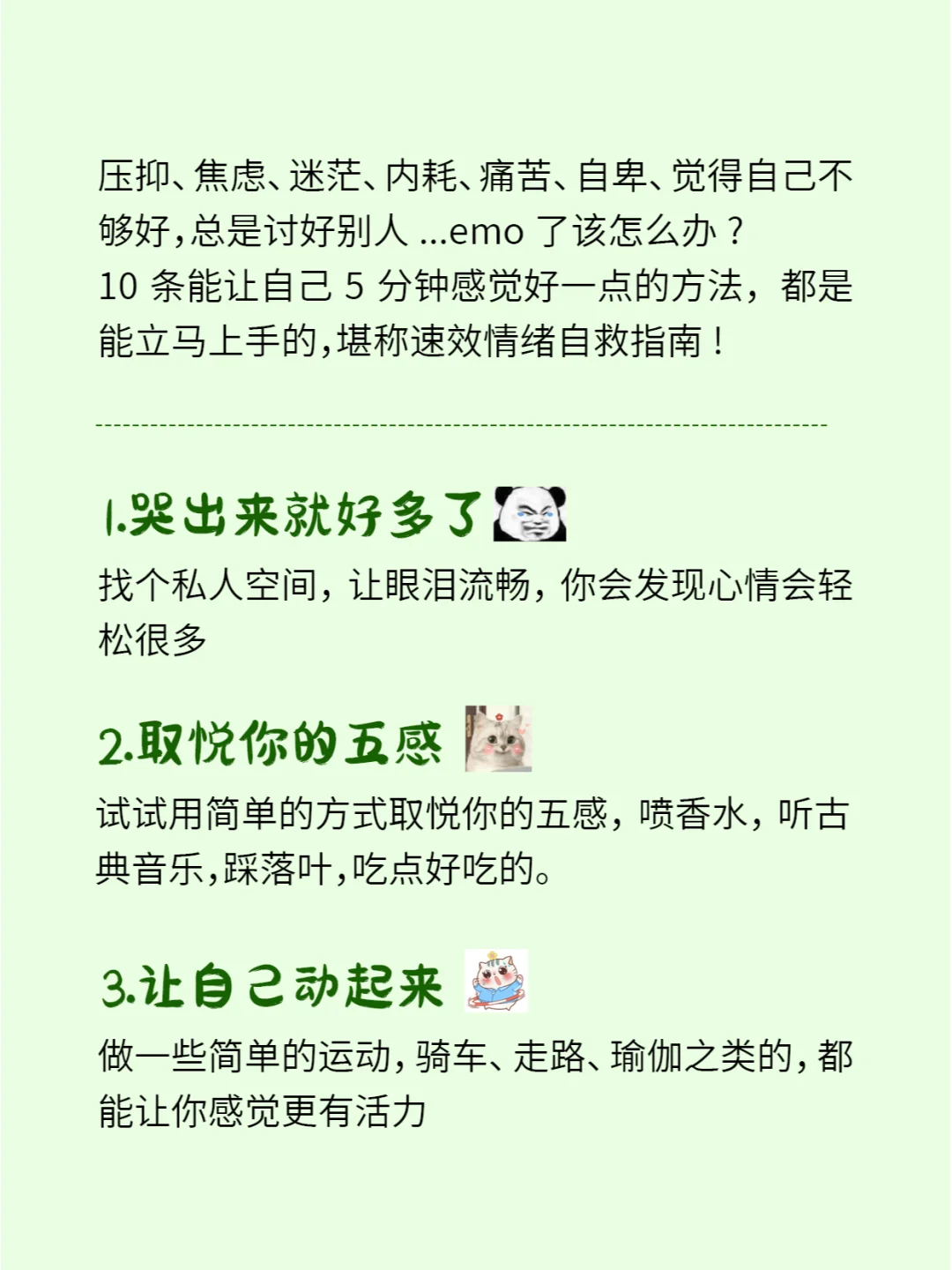 [萌萌哒R]情绪自救 5分钟摆脱emo! 10个速效情绪自救小妙招[派对R] 1.哭出来就好多了 2.取悦你的五感 3.让自己动起来 4找一个暂时的避难所 5与他人建立链接 6.好朋友永远是你的后盾,哪怕 TA 并不在场 7.可能有害,但管它呢! 8.疯一疯也没啥 9.听听内在宇宙的声音 10.最后,直面它 [种草R]记住,无论何时,都要善待自己,爱自己。 [斜眼R]你值得被爱,你值得快乐。