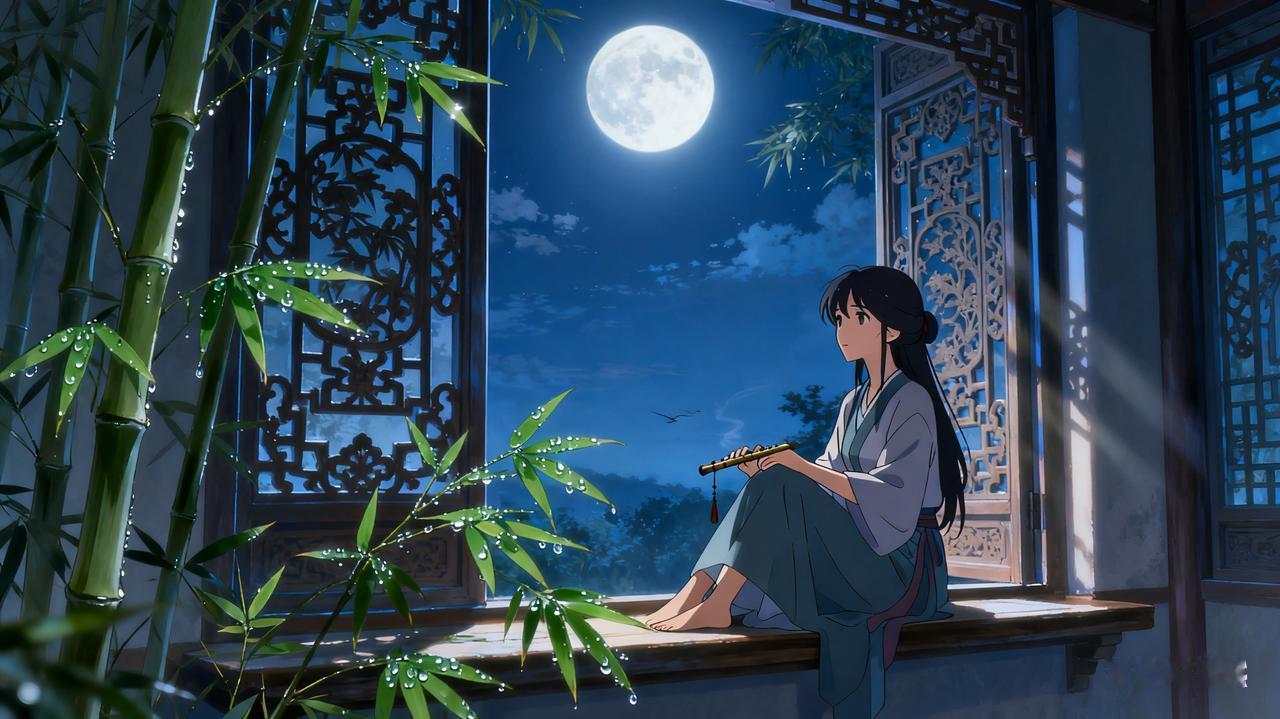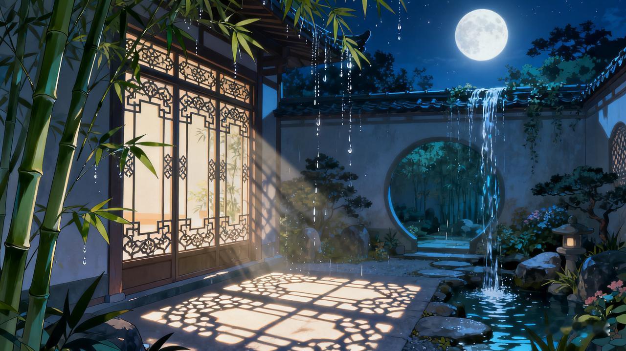 花影筛金落绮窗,冰轮碾玉夜初凉。 雕棂不锁青光注,竹露沾衣沁骨香。 远笛随风传别