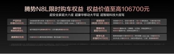 “超智能科技大座驾”腾势N8L 29.98万元起,重新定义家庭豪华出行标杆 10月28日,“大六座安全豪华SUV”腾势N8L正式上市,共推出2款车型,官方指导价为29.98万元~32.98万元!N8L全系标配“六大核心科技”,以超越传统豪华的品质标准,诠释家用车的豪华感、安全感与科技感,创造让全家人动心、舒心、省心、安心、暖心的出行体验,以“五心体验 三感相伴”,定义美好出行。 为回馈广大用户的支持与信赖,腾势N8L特别推出限时购车权益,权益价值至高10.67万元!包括价值1.7万元的三年免息,最高1万元的置换补贴。此外,不必担心因为交车晚,享受不到购置税补贴:在2025年11月30日24点前完成合同签署的用户,如果因非用户原因车辆未及时交付,导致开票实际发生在2026年,可享受购置税差额补贴,最高1.5万元! 腾势总经理李慧用三句话总结N8L,就是:超安全家庭大六座、超豪华移动大平层、超智能科技大座驾,以硬核技术实力重塑家庭大六座豪华SUV新标准,与每个热爱生活的家庭一起奔赴美好。 外观方面,腾势N8L延续家族“优雅之势”的设计语言:长宽高5200*1999*1820mm,拥有“新能源8系豪华SUV”中最大车身;侧面采用“纯平车门+隐藏水切”设计,营造精致高级的视觉感。内饰方面,搭配31.8㎡的软质包覆、透光真木等顶级工艺用料,以每一处精致细节为家人打造雅致温馨的美好出行家。 同时,腾势N8L空间超越同级:套内面积6.11㎡、人均超1㎡,结合超1.3米车内垂直高度,实现“三排一样大,座座都宽敞”,即便六个1.8米高个子成年人乘坐也非常宽敞,为用户打造“超豪华移动大平层”;而三排最大121°调节角度与100mm前后滑移等设计,更是让第三排和前排一样舒适。 全车六座电动座椅支持“一键切换”四大场景模式,并可自定义组合,形成“4+N”灵活布局,轻松适配多元家庭场景。最为贴心的是,腾势N8L还配备“迎宾模式”,解锁车身便自动下降5cm,最低离地间隙仅有11.5cm,老人小孩不用踮脚,轻轻松松上车。 整车设置49处收纳空间,搭配51L后备厢隐藏式储物盒,实现从日常随身物品到露营装备的“全场景收纳自由”。 驾控方面,腾势N8L全系标配“易三方”整车智能控制技术平台,凭借“插混专用2.0T高效发动机+三电机”组成的强大动力系统,零百加速仅需3.9秒。制动系统采用六活塞定钳,实现35.4米的优异刹车距离,确保强劲动力收放自如。 同时,腾势N8L后轮独立转向实现了4.58米同级最小转弯半径,灵活性甚至优于A0级小车,窄路调头也能从从容容、游刃有余。 AI智舱:让出行更愉悦、更新潮 腾势N8L将领先智能贯穿于上车前到旅程中的每处细节,以“超智能科技大座驾”姿态,让出行愉悦新潮。车辆支持腾势汽车APP一键备车,搭配手机UWB和NFC车钥匙功能,并拥有手车互联等功能。此外配备AR投影感应尾门,即便怀抱孩童或手提重物,亦可优雅开启后备厢,从容出发。 座舱内,11L超大智能冷暖三开门冰箱、17.3英寸娱乐吸顶屏与20扬声器帝瓦雷音响+杜比全景声+QQ音乐Hi-Res无损品质音源组合,结合采用十层材料结构双发泡填充的“云栖座椅”,以“冰箱彩电大沙发”打造家的舒适便利;此外,腾势N8L还获得了中汽中心“零甲醛”认证,搭配四温区双层流空调系统、定眩智能防晕车系统,共同打造沉浸式“移动客厅”。同时焕新更精致的UI界面,并首发推出腾势IP专属动态主题,情绪价值满满,让人机交互兼具智慧与情感温度。 作为腾势品牌豪华产品矩阵的战略车型,腾势N8L以“超安全家庭大六座、超豪华移动大平层、超智能科技大座驾”定义美好出行,让全家动心、舒心,让每一次旅程省心、安心且暖心。