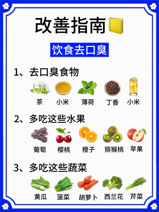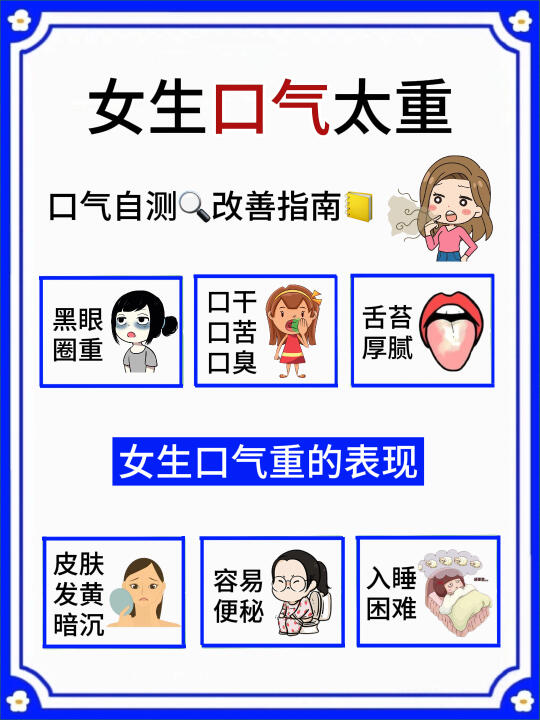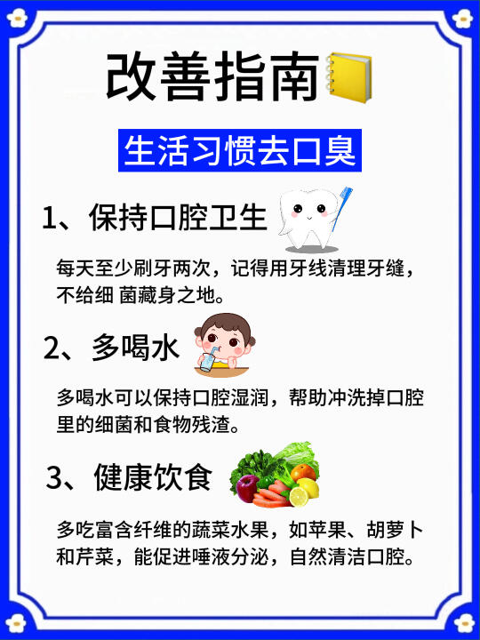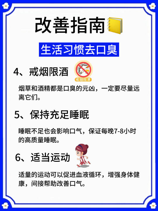 平时也要注意口腔卫生,认真刷牙,饭后漱口,减少重口味食物的摄入,保持早睡早起的习惯,适量运动,从内到外的调理,对预防口臭也很有帮助哦(具体详情看⬆️图)