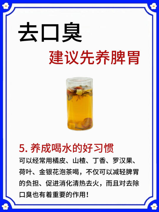 ✅养成喝水的好习惯,可以经常用橘皮、山楂、丁香、罗汉果、荷叶、金银花泡茶喝,不仅可以减轻脾胃的负担、促进消化、清热去火,而且对去 除口臭也有着重要的作用!