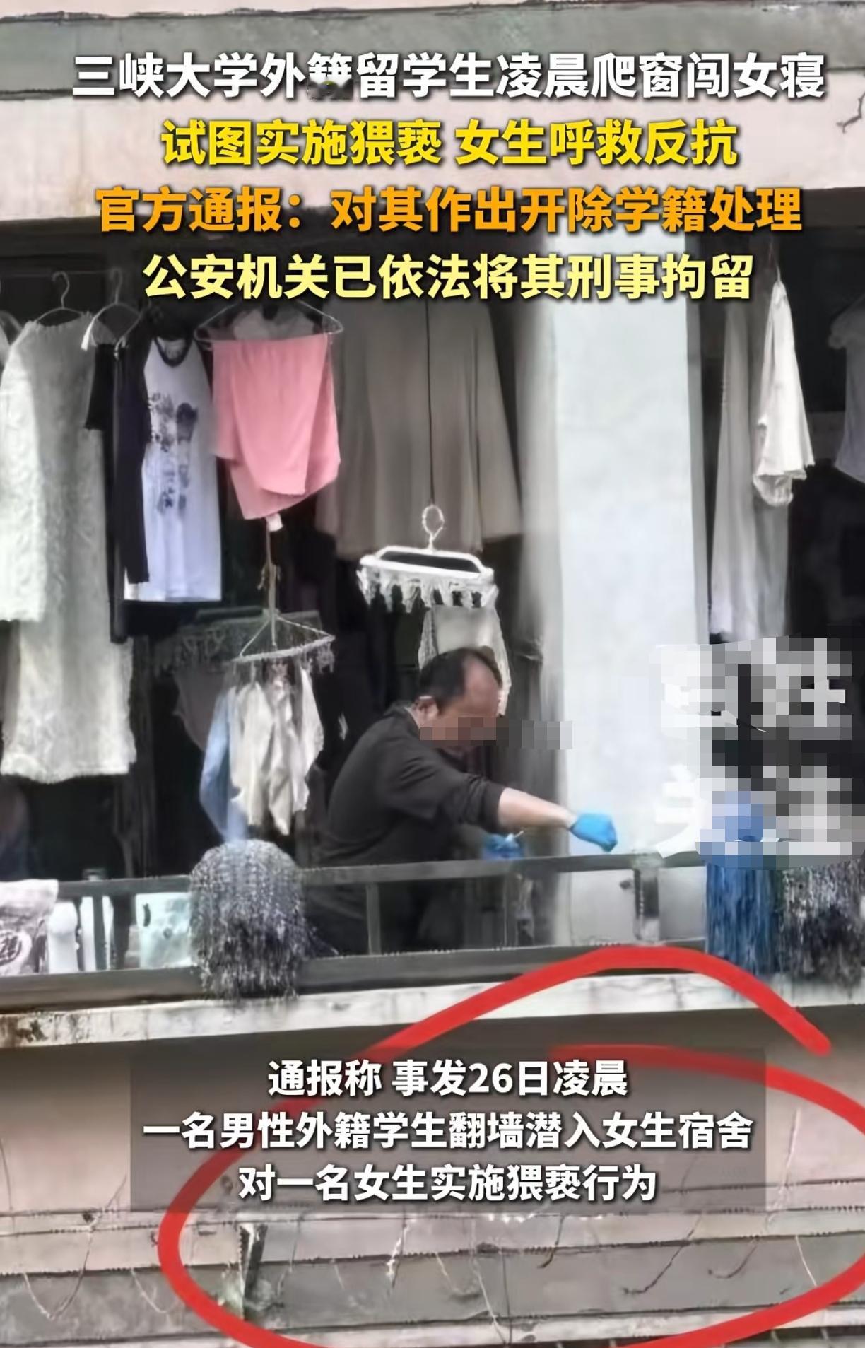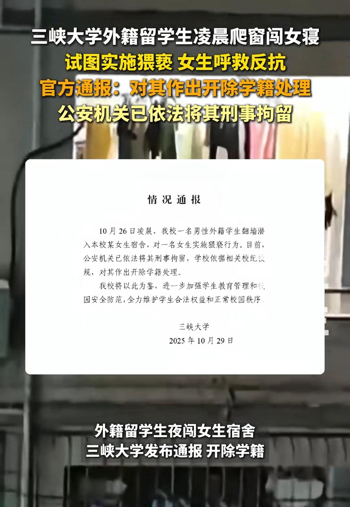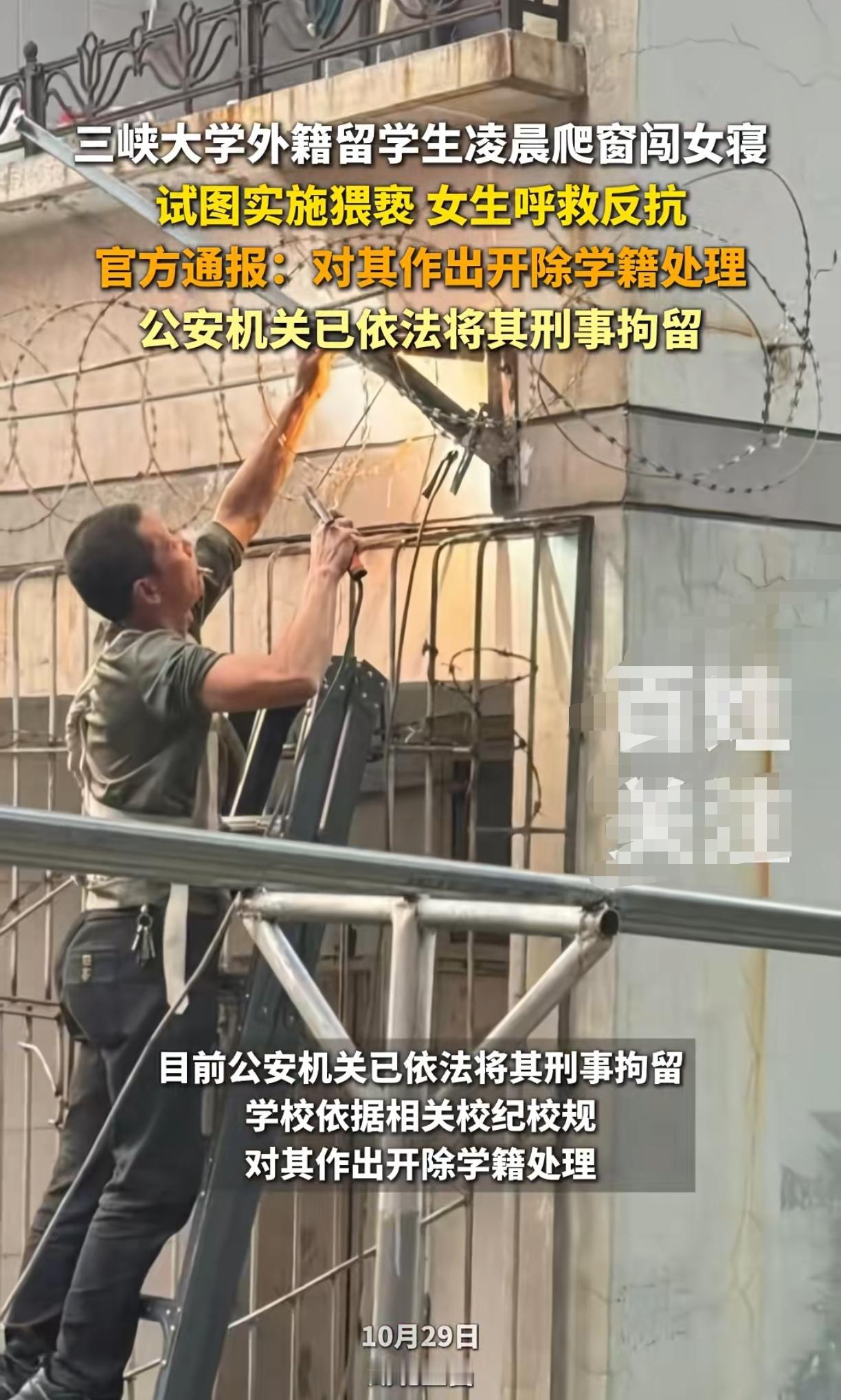 宜昌某高校留学生深夜爬进女生宿舍猥亵女生这事闹大了! 有网友爆料10月25日凌晨,一留学生爬楼进去女生宿舍二层,试图强一名女学生,女生喊叫声被人听见,该留学生逃跑,宿管阿姨随后报警,目前已经过去4天了,校方才发出通报,说该留学生“打伤一名女生”已经被开除学籍,并被警方拘留在案! 现在的女生宿舍楼已经加了防盗网,但并未提及说要将女生宿舍对面的这个男生留学生宿舍换到其他地方,女生们还是有些后怕,女生宿舍和留学生宿舍这么近,校方为什么这样安排,一定要给出一个说法并做出合理安排,全网监督着呢! 有人说“曝出来这么多天迫于舆论才做出这种处理的,最开始可不是这种态度”,留学生在每个学校都是特殊待遇,这是为什么? 不少人很气愤,为什么每年出了这么多留学生相关问题,可还是不断的引进这些人,要不是帖子被曝光,学校还打算继续压下去吗? 直到记者采访学校工作人员,他们还是那句“具体情况不方便透露”,搞不懂为什么到现在了还要特权这些留学生,对待自己人可不是这样的!