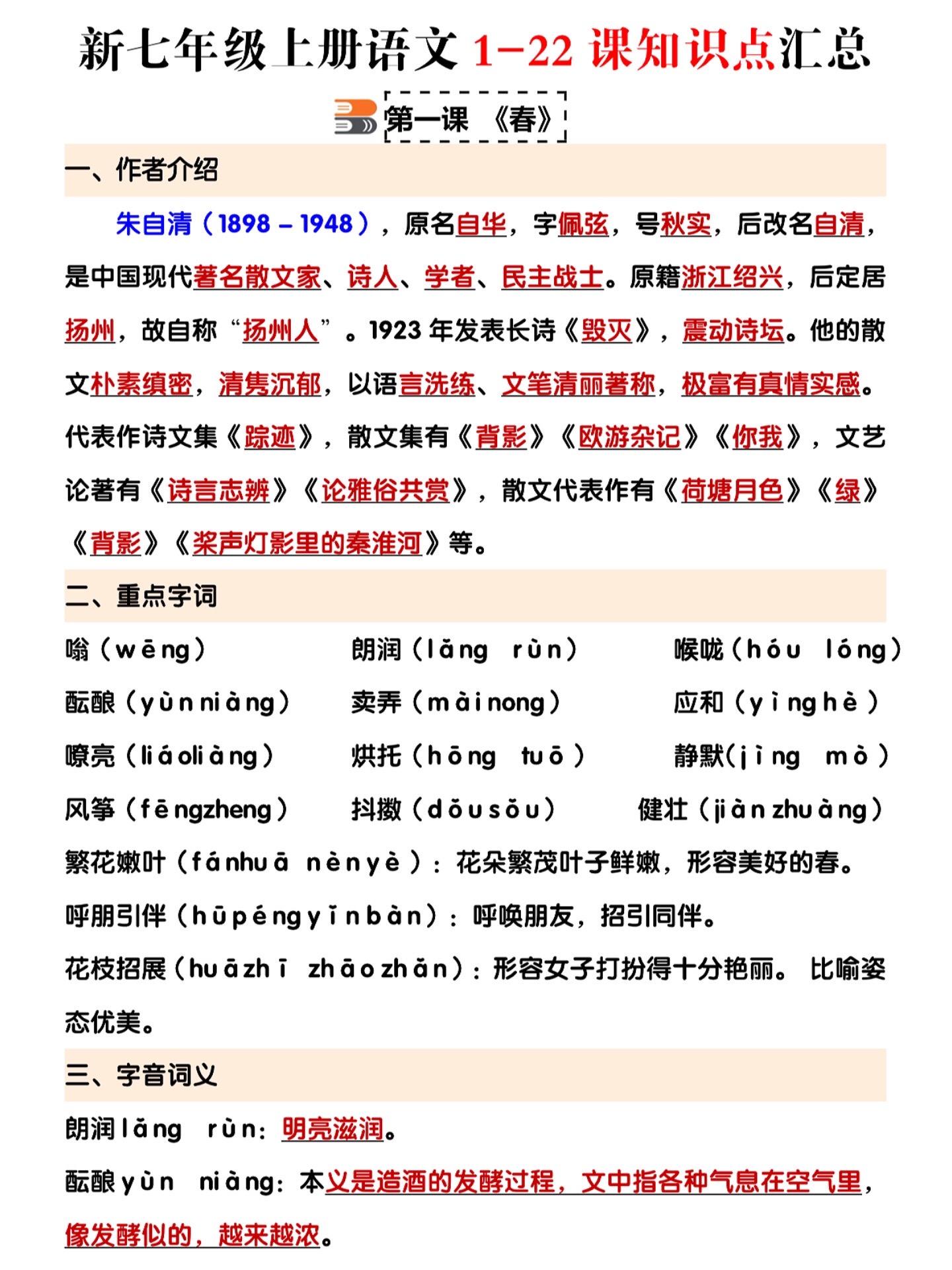 七年级上册语文1-22课期中复习知识点。七年级上册语文1-22课期中复习知识点,老师给大家整理出来了。家长给孩子打印一份出来学习,都是考试常考常出题,完整版可打印,快给孩子打印一份出来学习吧!