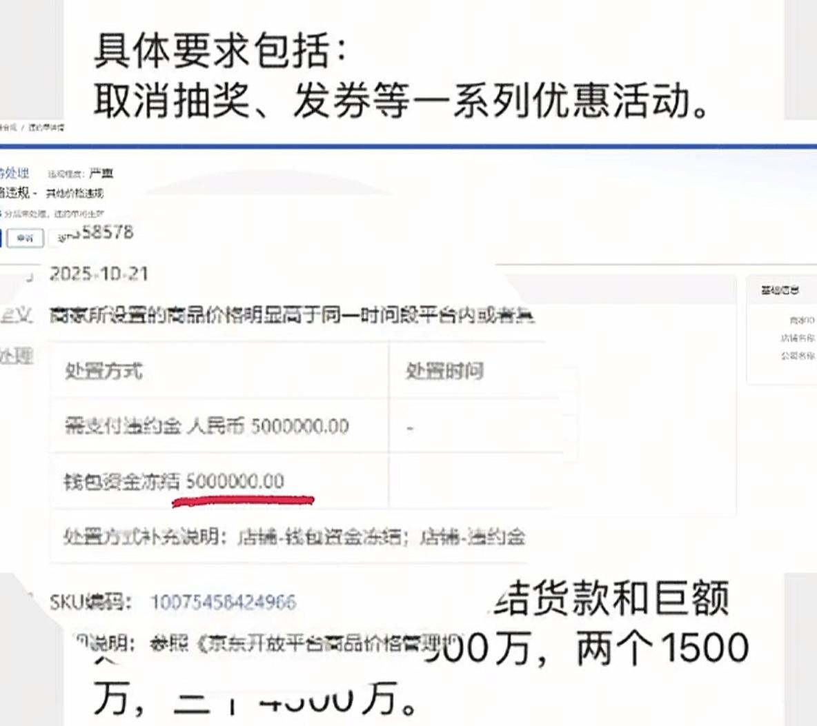 京东这事儿彻底实锤了!500万罚单真罚过,最后又给撤了。之前官方那边一会儿说没有,一会儿商家这边说有,现在申诉截图一出来,谁都别想再含糊。 事情得从双11前说起。京东10月16日刚生效一个新规则,叫《京东开放平台商品价格管理规则》。这规则里写得明明白白,商家要是在别的平台卖得比京东便宜,就算是别的平台给了补贴,也属于“不合理制定价格”。情节严重的话,最多罚100万。这规则刚落地没几天,就有人撞到枪口上。 10月21日,一家头部家电企业栽了。他们有款产品在别的平台享受补贴,售价比京东低。京东直接按新规则办事,冻结了这家企业500万货款当违约金。500万啊,比规则里说的100万上限多了整整4倍。商家肯定不甘心,三天后就提交了申诉。申诉理由列了两条,一是他们在京东的售价已经和抖音那边对齐了,二是所谓的“竞对链接”没给京东平台造成“实质性影响”。没想到,京东还真同意了申诉,把处罚给撤销了。 更有意思的是,不光这一家。有消息说,京东那段时间还罚了其他家电商家,金额也都是几百万元。之前网友晒出罚单截图,说有家店因“价格违规”被冻了500万。接着就有“接近京东的人士”跟媒体说没这事儿,另一边“接近商家的人士”又说罚单是真的。两边各说各的,谁都没拿出实锤,大家都在猜到底是谣言还是真相。 直到有人把商家申诉成功的截图发出来,这事儿才算有了定论。申诉函里的细节,跟之前网友晒的罚单对得严丝合缝。违约单号、违规定义、违规说明、处理内容,就连SKU编码都一样。要是只有一张罚单截图,可能还会有人说“孤证不立”,但现在申诉函和罚单互相印证,还有其他商家被处罚的消息,这事儿根本没法再否认。 按说新规则刚生效,执行起来该按规矩来。规则里写死了上限100万,京东却直接罚到500万,这操作让人看不懂。商家的货款和押金都在京东平台上,难道就因为这个,就能不按规则来?现在虽然申诉成功撤了处罚,但当初为什么会超上限罚款,还有没有其他没申诉或者申诉没成功的商家,这些问题都还没答案。 接下来京东会不会回应超上限罚款的事儿?那些被罚款的其他商家,最后都怎么处理了?这些都得等后续消息。 大家觉得京东这次操作合理吗?来评论区说说你的看法。