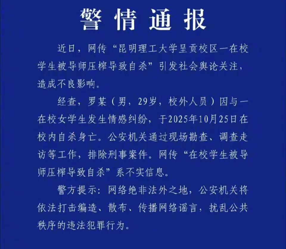 天涯何处无芳草!这句流传已久的俗语,藏着对感情最通透的劝解,却总有人在情海中迷失方向,最终酿成无法挽回的悲剧。 近日,网传“昆明理工大学呈贡校区一在校学生被导师压榨导致自杀”引发网络热议。经查,死者名叫罗某(男,29岁,校外人员)因与该校一名女学生存在情感纠纷,于2025年10月25日在校内轻生。 世间感情的美好,在于“双向奔赴”的契合,若只是单方面的执念,强求不来时,及时放手才是对自己的善待。 愿每一个人都能理性对待感情,明白“天涯何处无芳草”的深意,在爱中保持清醒,在失去时学会释怀。生命只有一次,切勿因一时的情伤,让遗憾成为永恒。珍惜自己,才能拥有更多可能,这才是对生活最好的回应。