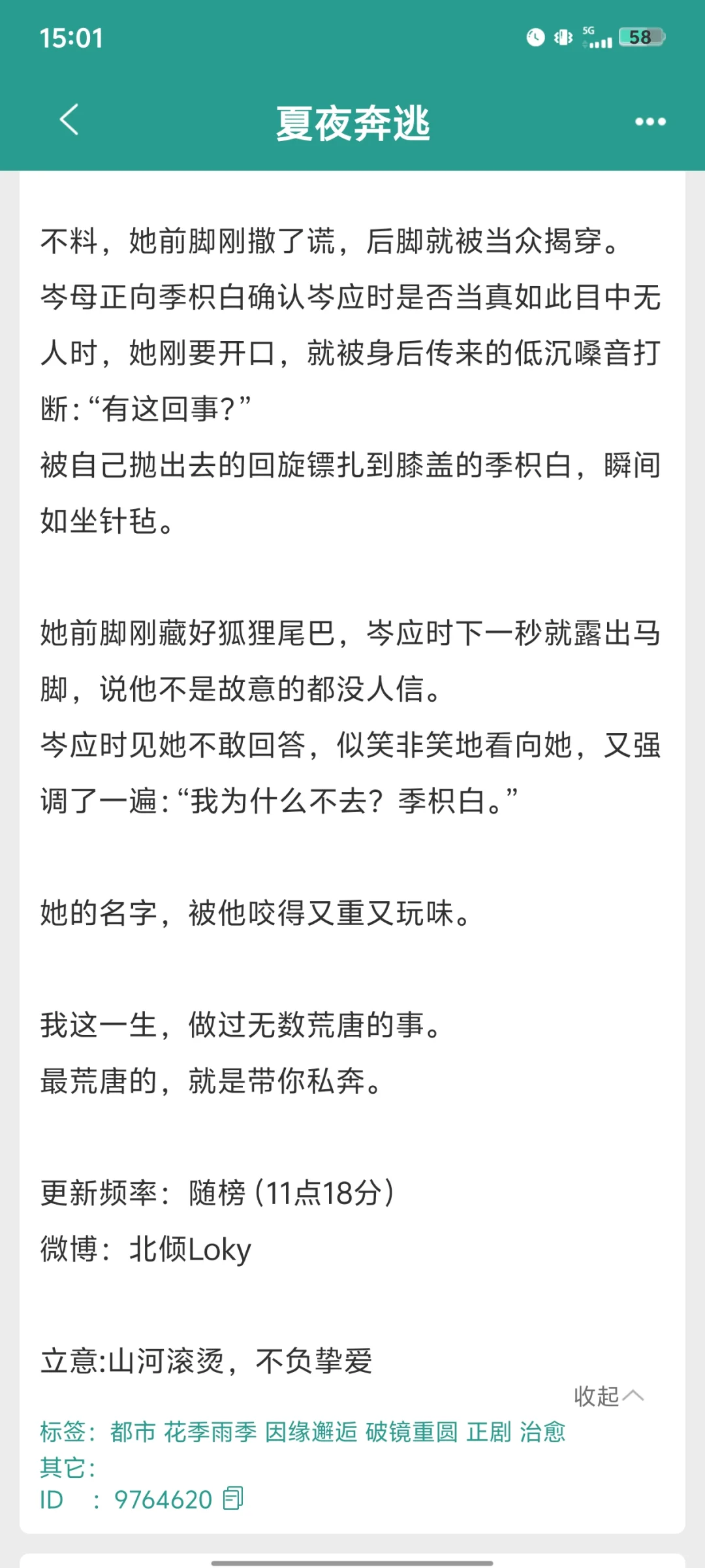 《夏夜奔逃》by北倾 正在连载的小说 洒脱民宿老板vs傲娇富二代 男女主背着家人偷偷恋爱,可是男主家有选定的儿媳妇,所以女主选择分手。分手多年后,两人在朋友的婚礼上“偶遇”,其实都是男主的精心算计。这么多年了,是谁放不下咱就不说了哈哈哈哈哈哈!可惜女主不打算吃回头草,男主开始追妻火葬场! 这本好好看,尤其是那种旧情人重逢,周围都是熟人,还不能被熟人发现两人谈过的感觉好刺激啊哈哈哈哈!