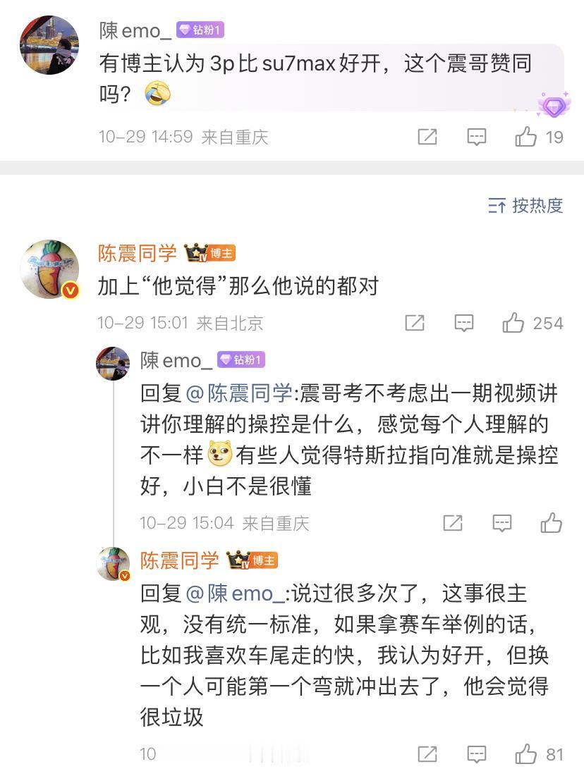 网友:你承不承认model3比SU7好开? 陈震:我不承认,Model3相比Su7 配置太低了,操控方面小米SU7有纽北背书呢,Model3呢? 同时陈震还表示,关于驾驶感受方面是一个非常主观的事情,他还用相关的例子给说明了。 陈震:我个人认为日常代步属性舒服、智能,才是好开,这没问题吧? 这就和大家吃甜豆腐脑还是咸豆腐脑一样,有的人认为咸豆腐脑好吃,但是我偏偏认为甜豆腐脑好吃,所以这个东西就是很主观上的东西。 主观上东西说谁更好不具备参考意义,但是对于自己来说,自己的体验才是最重要的,关于哪台车更适合自己,大家还去试驾一下吧。