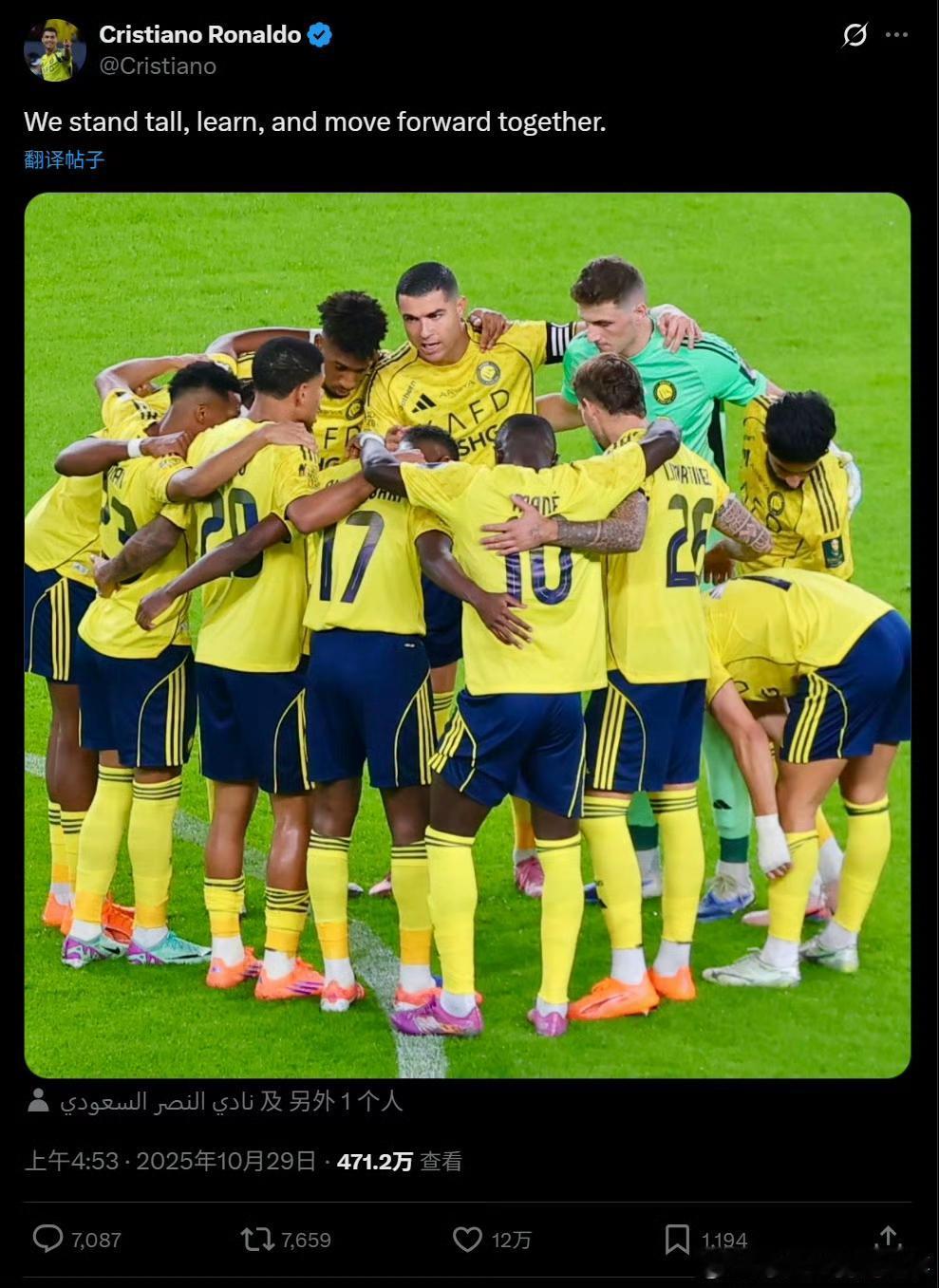沙媒:杯赛被淘汰后C罗脸上写满愤怒,随后直接返回更衣室。 赛后C罗社媒晒照鼓励队友:我们昂首挺胸,一起学习并且继续向前。 网友P的图:输球放团队,赢球单人照。