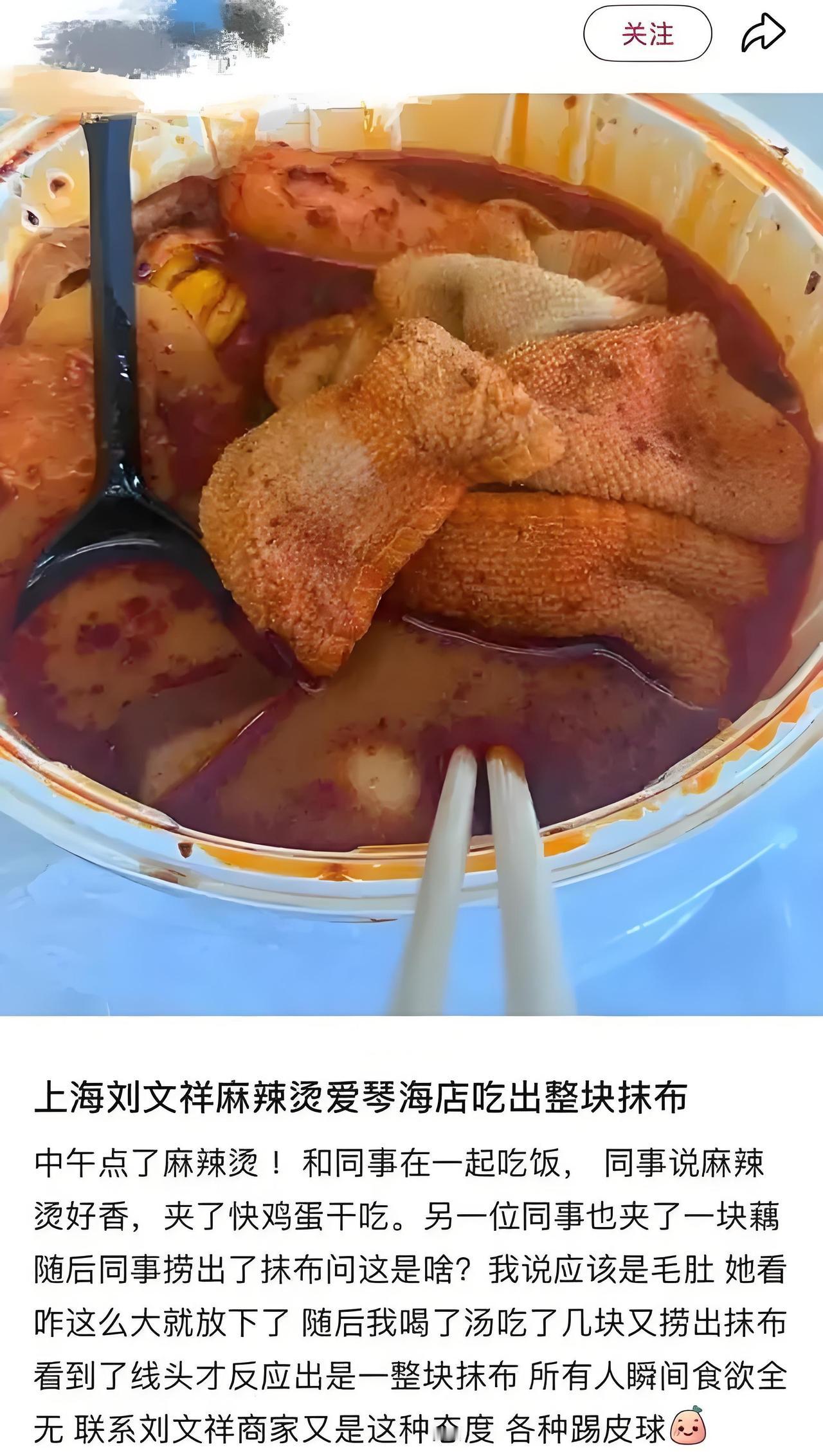 救命! 这麻辣烫吃的 也太yue了! 网友点外卖涮菜, 夹起一“片”软乎乎的东西,起初还以为是煮软的毛肚,嚼了两下不对劲——居然是块带油污的抹布! 赶紧拍图找商家,结果对方不仅不道歉,反倒凶巴巴怼人:“你故意找茬是吧?再闹我报警!” 这操作直接给人整懵了! 网友把聊天记录和抹布照片一晒,评论区炸了:“这后厨是把清洁工具和食材一起煮吗?”“商家报警?该报警的是消费者吧!” 现在点外卖都得睁大眼睛,谁知道下一口吃的是菜还是“清洁用品”啊!