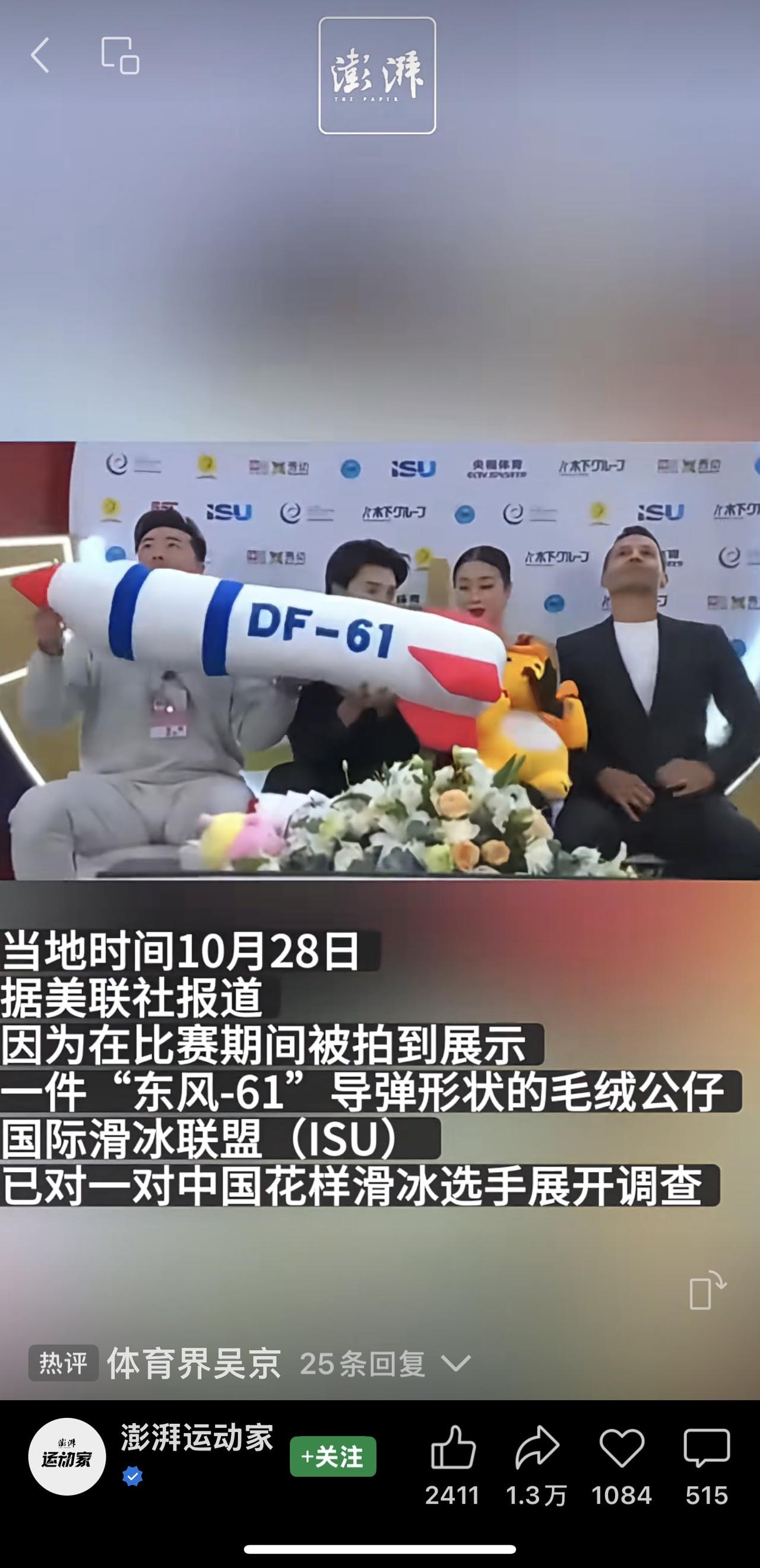 在重庆举行的中国杯花滑比赛中,中国选手任俊霏和邢珈宁捡起了观众扔下的一个DF-61导弹造型玩偶。国际滑联随后声明,对此“深表遗憾”并启动调查,依据是其禁止在比赛区域展示政治或军事象征物的规定。