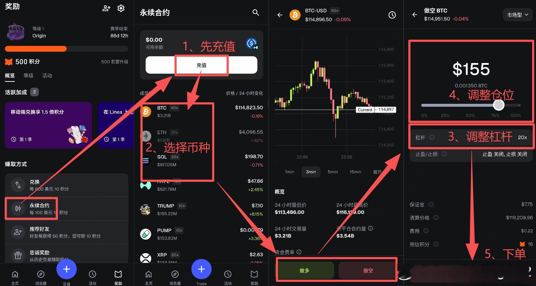 赚取方式——永续合约——充值——可以选择任意资产进行充值——选择想要交易的币种——调整仓位和杠杆——下单