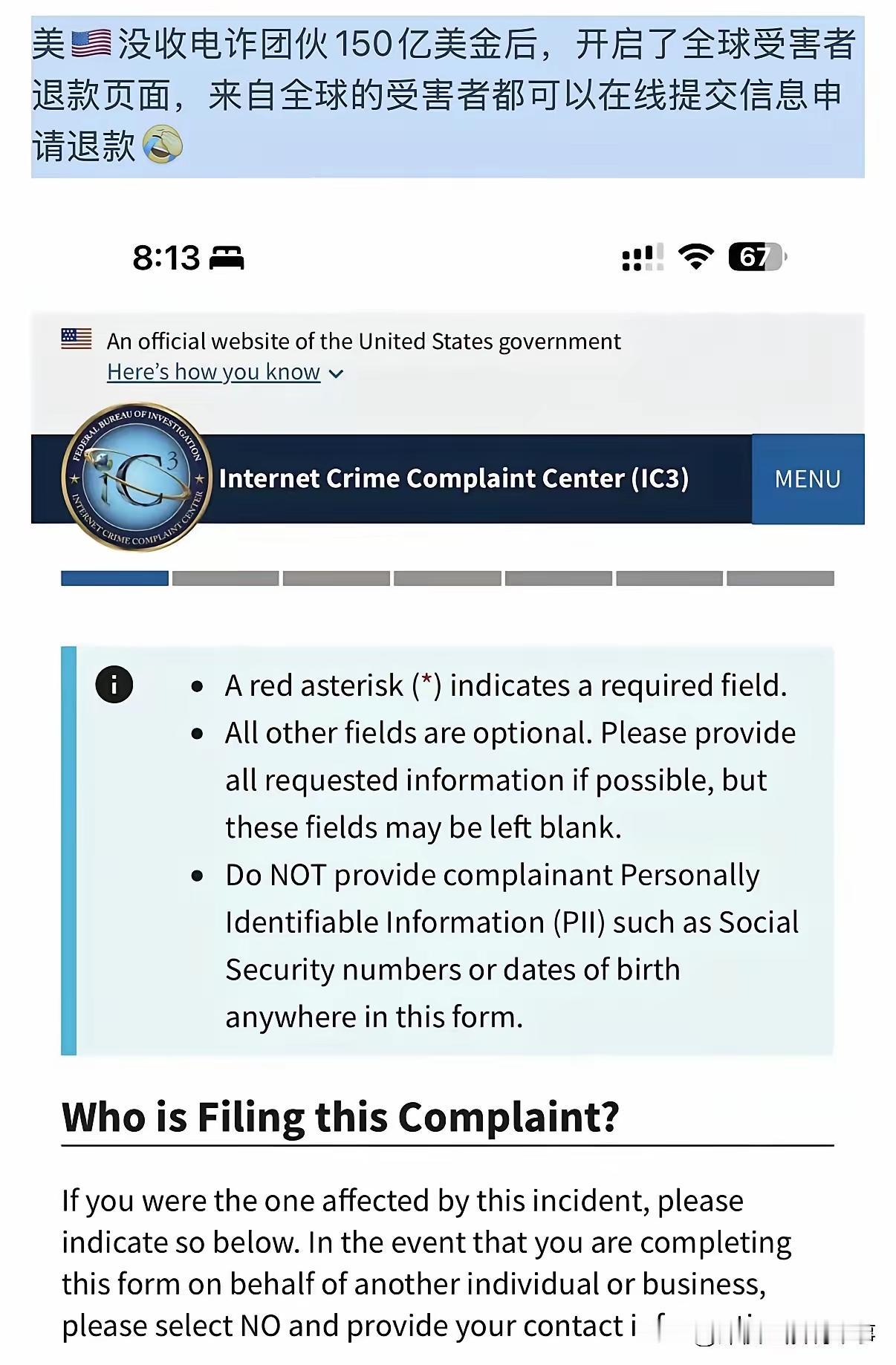 美国没收电诈团伙150亿美元之后,美国开启了全球受害者退款页面。来自全球的受害人都可以在线提交申请退款。如果是真的话,我为美国的这一举动点赞。广而告之,我国受害人的赃款有望追回。钱失而复得,不容易啊!可不要再相信天上掉馅饼的神化。勤劳致富,心里才踏实,花的才安心。