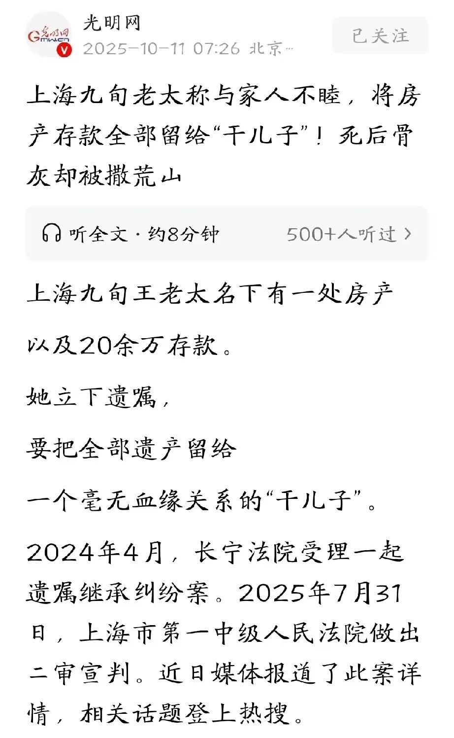 91岁老太将房产存款全部留给干儿子,死后骨灰却被撒荒山。 上海长宁,老太有4个子女,一直由小儿子照顾,后来,小儿子被确诊肺癌,她被送去养老院。3年后儿子病情恶化先她去世。 后来孙子发现,老人被“干儿子”带去山东联系不上。4年后干儿子起诉,说老人把房子和存款都留给他。 老人孙子也提交3份证据,法院审理过程中,却发现多个疑点。 王老太因早年离异,与三名子女的关系一直不太亲近,她的生活起居,只能由小儿子林某照顾。 2016年,林某自己得了重病,无奈之下,将王老太送进了养老院。 2019年,林某的病情突然恶化,不幸离世,他的儿子小林在料理完父亲的后事后,第一时间想到了独自住在养老院的奶奶。 小林赶到养老院,打算与奶奶商量,由自己来承担起照顾她的责任。 但令他震惊的是,养老院工作人员告诉他,王老太早在2019年年底,就被一位自称是她“干儿子”的刘某接走了。 对方声称要带老人去山东探亲,之后便再无音讯。 小林感到十分困惑,他从未听家人提起过奶奶有什么“干儿子”。 原来在2016年林某病重期间,王老太在养老院附近结识了刘某。 刘某自称从小学习医术,经常在养老院门口为老人免费看病。 他主动为王老太治疗骨髓炎,赢得了老人的信任,便认他做了“干儿子”。 后来,刘某以共同生活、方便照顾为由,在2019年底将王老太从养老院接走。 更让小林难以接受的是,2023年11月2日,91岁高龄的王老太,在两名律师的见证下立下一份遗嘱。 声明自己去世后,名下所有财产均由刘某继承。 不久,刘某将王老太的家人告上法庭,要求法院支持他按照遗嘱继承财产。 在法庭上,刘某坚称这份遗嘱程序合法,是在律师见证下完成的,自己继承遗产合情合理。 但小林提出质疑,王老太早在2014年,就立下一份公证遗嘱,明确表示将房产留给他这个孙子。 从常理来看,王老太有亲生子女和孙子,怎么会将全部财产留给一个毫无血缘关系的外人? 法官在审理过程中,仔细审查了新遗嘱的见证笔录,和视频录像,发现了诸多疑点。 录像中,王老太亲昵地称呼刘某为“大儿子”,并提到“小儿子林某在2023年刚去世”,还说其他子女都不管她。 而“老大”以前在国际维和部队工作,去过70多个国家,没有房子,所以把遗产留给他。 然而对于这些说法,刘某全盘否认,称这些都是王老太从别处听来的传言,自己根本没有参加过维和部队。 刘某还解释说,自己不擅长使用微信,王老太到山东后手机损坏,更换了号码,因此亲友才无法联系上她。 随着调查的深入,法官调取了王老太最后的抢救记录,发现了更加令人心寒的事实。 2023年12月22日的病历显示,老人在被送到医院前,已经昏迷、呼吸困难、口吐白沫长达六小时。 这意味着,刘某在发现王老太生命垂危后,竟然拖延了数小时才呼叫急救,严重延误了抢救时机。 同时查出,王老太每月上万元的养老金,以及她多年积攒的20余万元存款,在她去世前一年左右,被陆续从定期转为活期。 这些钱最终通过ATM机,连续多天分多笔被取走。 面对这些确凿证据,刘某赶紧改口,称这些钱是王老太“赠与”他的,部分用于购买药品,但他无法提供任何赠与证明。 调查还显示,刘某在和干妈共同生活期间,几乎将老人的存款全部取光,这种行为显然不是出于善意扶助。 更让人无法接受的是,王老太去世后,刘某既没有通知她的任何家属,也没有为她办理后事,而是将老人的骨灰随意撒在了山野。 这种做法严重违背了基本的人伦常理。 经过法院深入调查,刘某没有正当职业,他利用王老太对军人的特殊感情,精心编造虚假人设。 刘某提供的有律师见证的遗嘱,存在虚假情况,影响了遗嘱的真实性和有效性。 而王老太2014年的公证遗嘱具有较高的证明力,也更符合常理。 《民法典》第一千一百四十三条:无民事行为能力人或者限制民事行为能力人所立的遗嘱无效。 遗嘱必须表示遗嘱人的真实意思,受欺诈、胁迫所立的遗嘱无效。伪造的遗嘱无效。遗嘱被篡改的,篡改的内容无效。 刘某提供的有律师见证的遗嘱,存在诸多疑点,刘某很可能存在欺骗王老太的行为,影响了遗嘱的真实性。 《民法典》第一千一百二十五条:继承人有下列行为之一的,丧失继承权:(五)以欺诈、胁迫手段迫使或者妨碍被继承人设立、变更或者撤回遗嘱,情节严重。 受遗赠人有本条第一款规定行为的,丧失受遗赠权。 刘某在与王老太共同生活期间,几乎取光老人存款,拖延王老太的抢救时机。 在王老太去世后未通知家属且随意处置骨灰,这些行为,虽未直接符合前面几款的典型情形,但从整体来看,其行为严重违背人伦常理和基本道德。 因刘某并未真正对老人尽到赡养义务。 因此,法院驳回刘某诉求。 对此你怎么看?